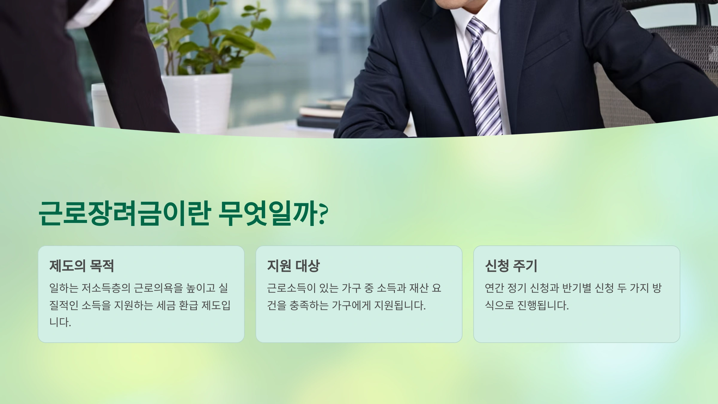 근로장려금은 열심히 일하지만 소득이 적은 근로자 가구를 지원하는 제도입니다. 쉽게 말해 '일하는 저소득층'에게 정부가 현금을 지원하는 복지 정책이라고 볼 수 있습니다. 이 제도는 근로 의욕을 높이고 소득을 보전해주는 목적을 가지고 있습니다.