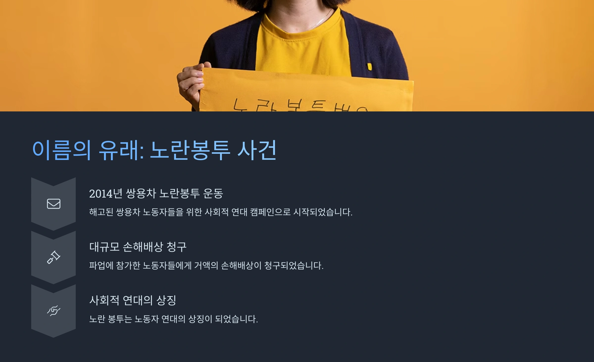 노란봉투법의 이름은 2014년 쌍용자동차 파업 사태와 깊은 연관이 있습니다. 당시 쌍용차 노동자들은 파업을 진행했고, 이에 회사 측은 무려 47억 원에 달하는 손해배상을 청구했습니다. 이 소식을 들은 시민들이 노동자들을 지지하는 마음으로 '노란봉투'에 각자 4만 7천 원씩 모아 전달한 사건이 있었습니다.
