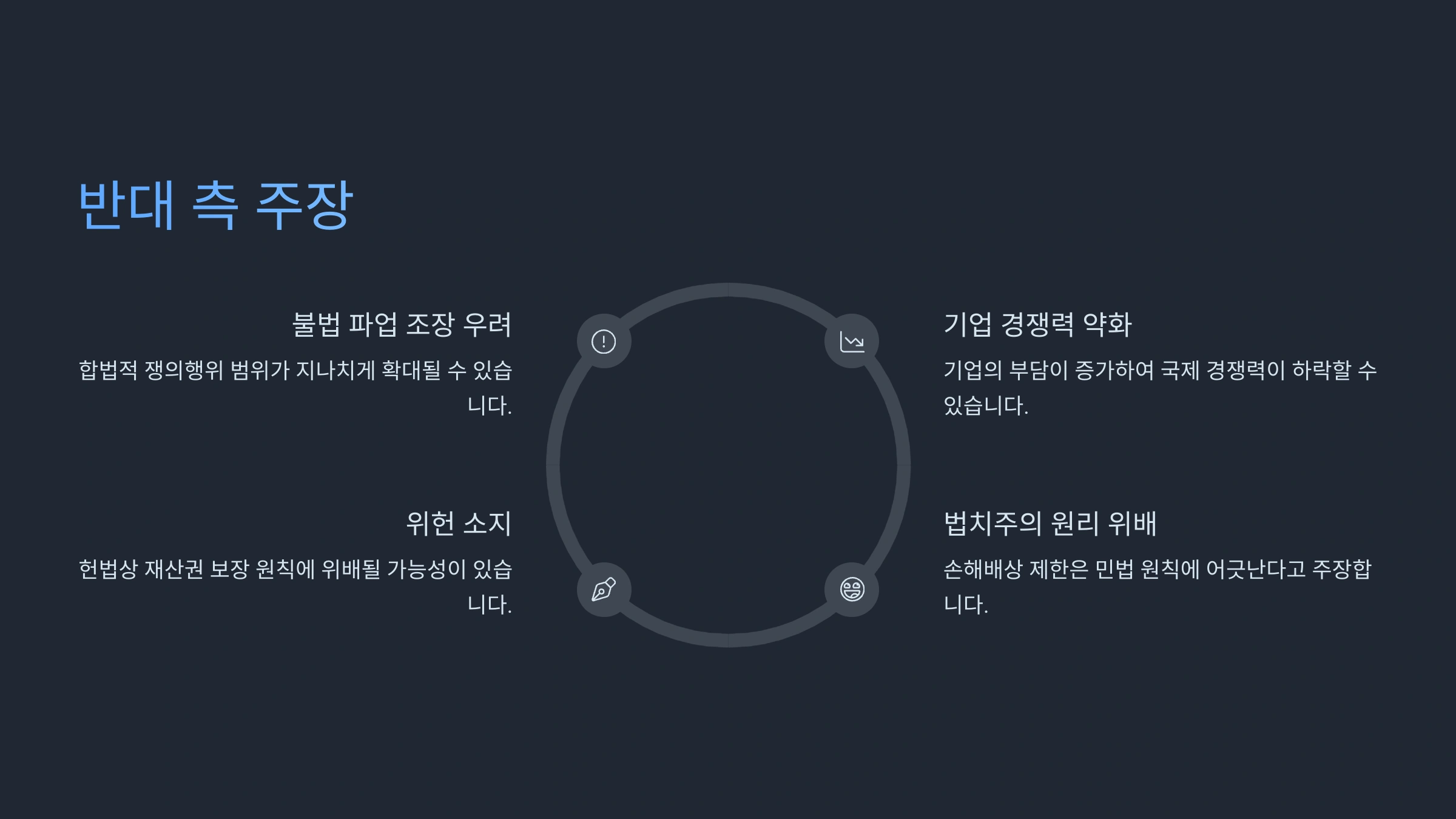 또한 찬성 측은 2014년 쌍용차 사례를 들며, 파업에 참여한 노동자들이 감당할 수 없는 거액의 배상금 부담으로 극단적 선택을 하는 비극이 반복되어서는 안 된다고 강조합니다. 노동자들이 정당한 권리 행사를 두려워하지 않도록 법적 보호장치가 필요하다는 것입니다.