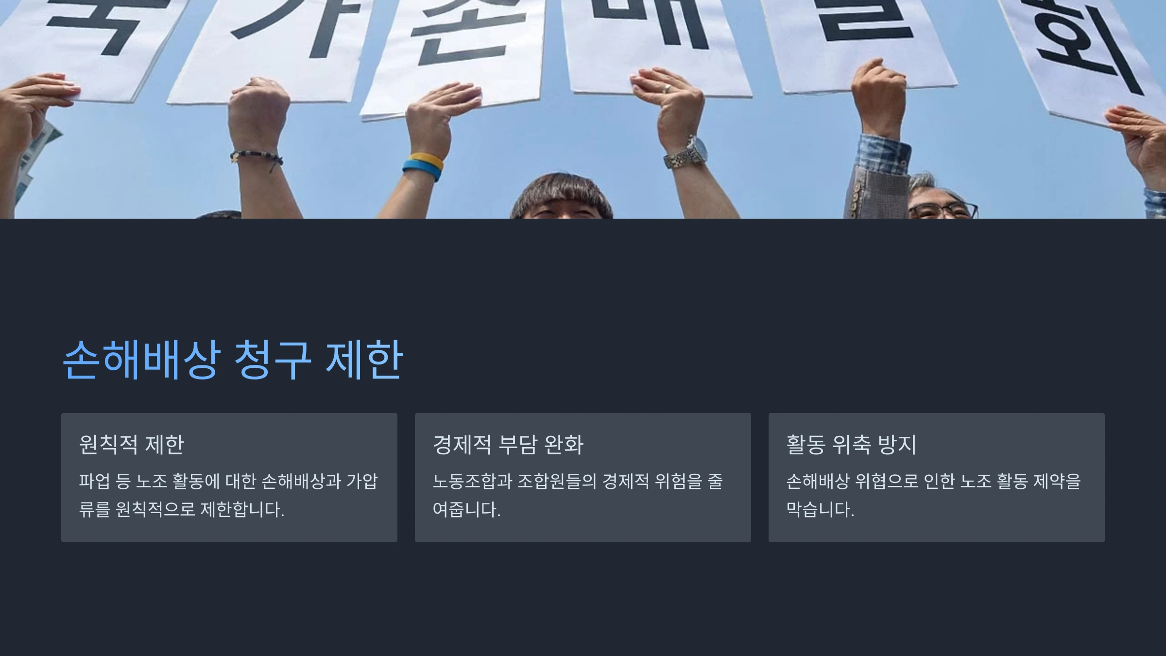 이는 2014년 쌍용차 사태처럼 노동자들이 감당할 수 없는 거액의 배상금 때문에 삶이 파탄나는 상황을 방지하기 위함입니다. 노동자들이 정당한 권리 행사를 위한 파업에서 경제적 불안 없이 자신의 목소리를 낼 수 있도록 하는 취지입니다.