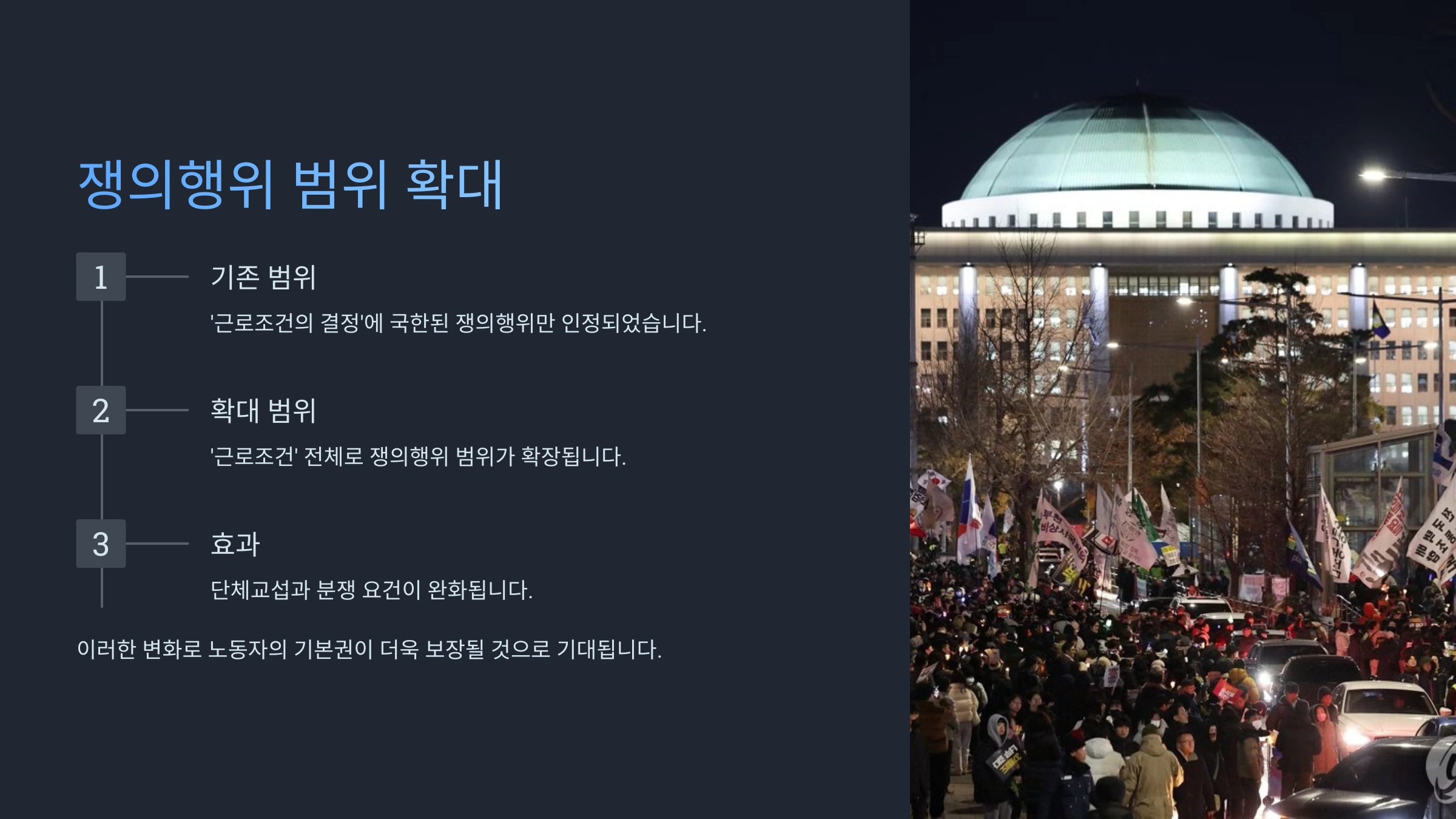 물론 이 부분은 기업 측에서 가장 우려하는 부분이기도 합니다. 쟁의행위 범위가 확대되면 파업이 증가할 수 있고, 이는 기업 운영에 부담이 될 수 있다는 주장입니다.