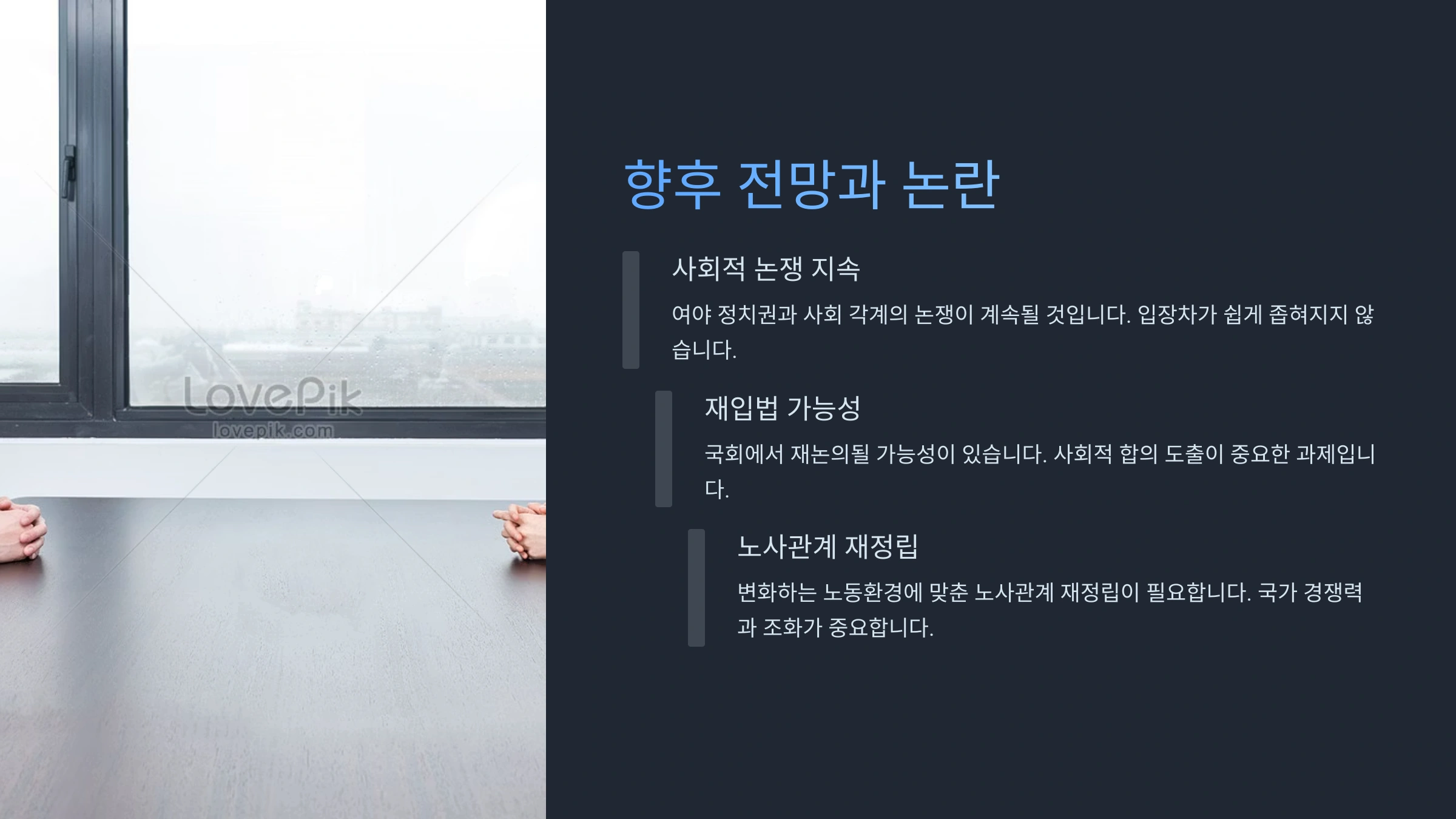 노란봉투법의 최종 통과 여부는 정치권의 힘겨루기와 사회적 합의 도출 과정에 달려 있습니다. 이 법안이 어떤 형태로 최종 결정될지는 여전히 미지수입니다.