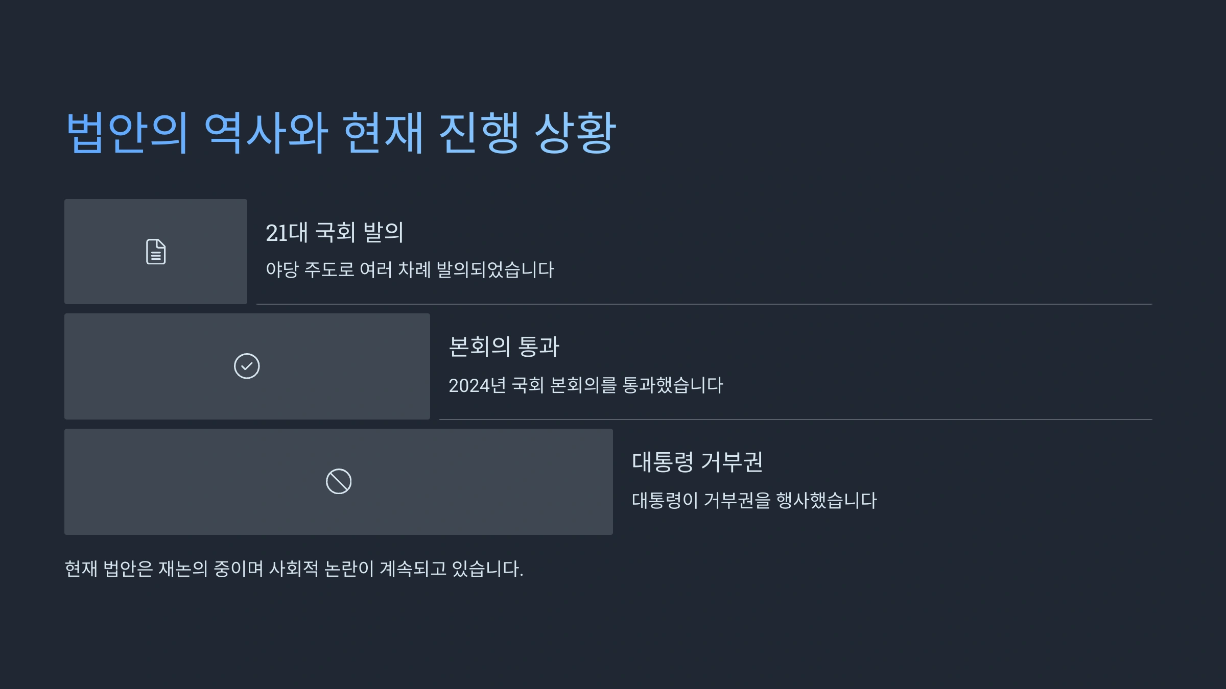 | 현재 | 대통령 거부권 행사 가능성 높음, 국회 재의결 여부가 관건 |