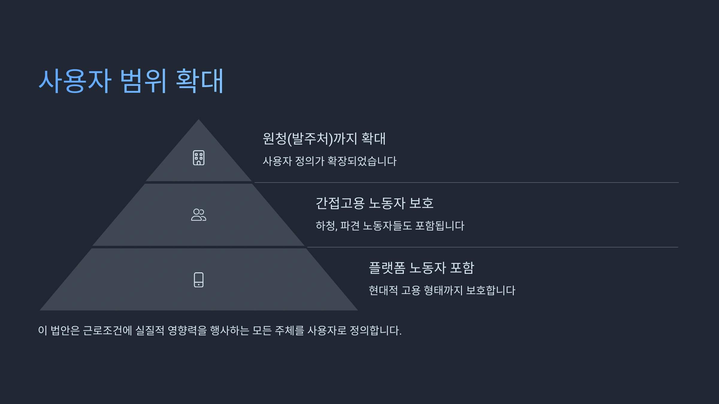 노란봉투법의 첫 번째 핵심 내용은 '사용자' 개념의 확대입니다. 기존 노동법에서는 직접 고용 계약을 맺은 사업주만을 '사용자'로 정의했지만, 개정안은 실질적 지시 권한을 가진 원청업체도 사용자로 포함시킵니다.