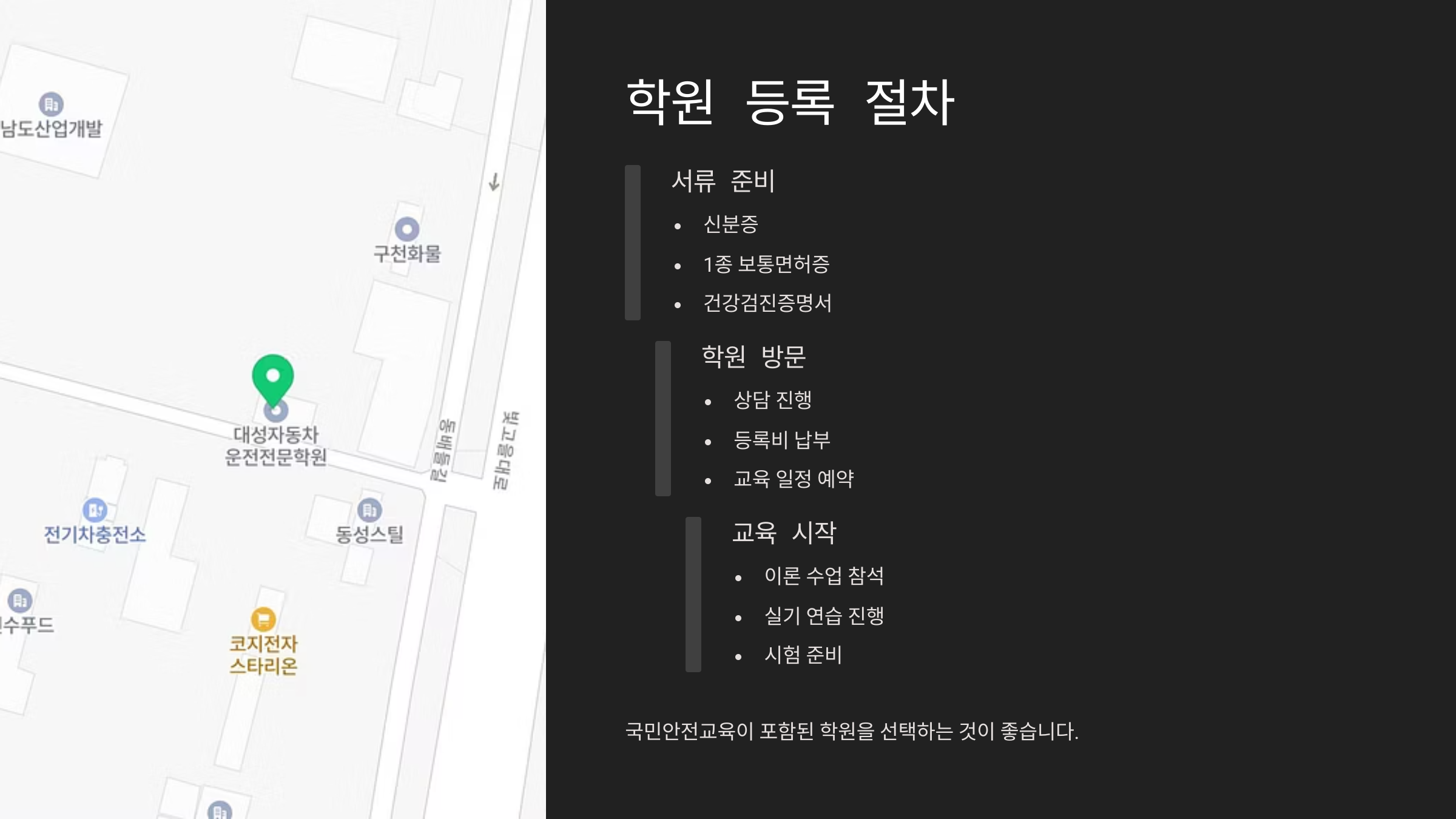 대부분의 학원은 정부 지정 교통안전교육 이수, 신체검사, 운전경력 확인 등 몇 가지 필수 절차를 요구한답니다. 이를 미리 준비하면 등록 과정이 훨씬 빨라져요.