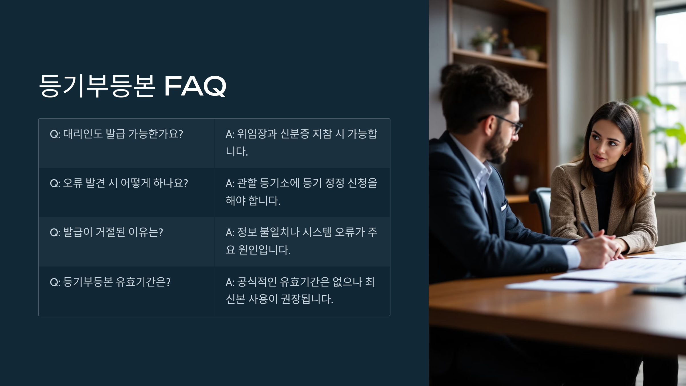 이제 마지막 섹션인 FAQ에서 등기부등본 관련 가장 자주 묻는 질문과 답변들을 모아서 소개해드릴게요. 놓치기 쉬운 포인트들을 다시 체크할 기회예요!
