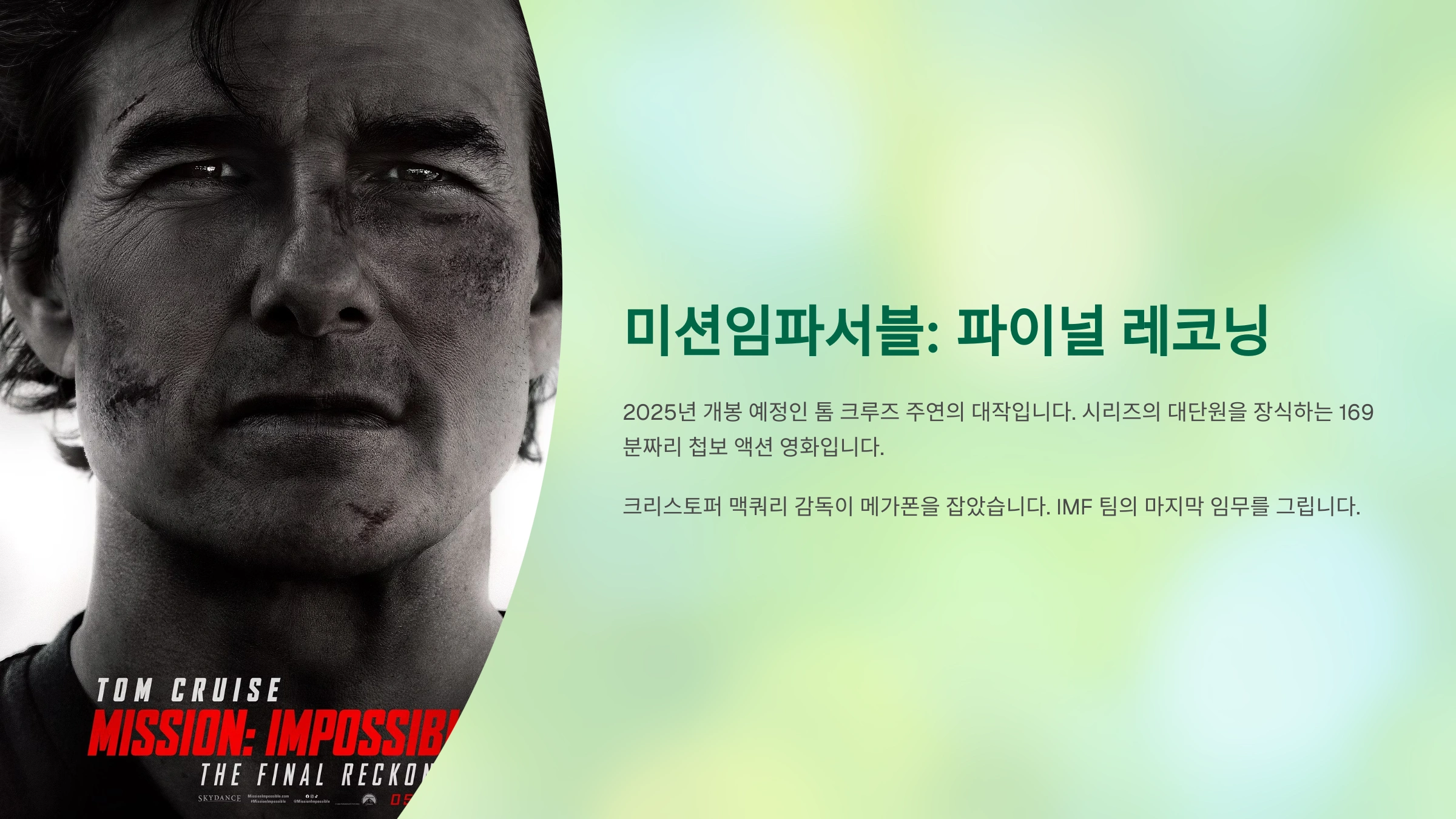 에단 헌트가 돌아왔습니다! 핵폭탄 위협과 테러리스트 조직 '신디케이트'의 음모를 막기 위한 아찔한 임무가 시작됩니다. 미션임파서블 파이널 레코닝은 시리즈 중 가장 긴박한 스릴과 화려한 액션으로 무장한 작품입니다. 에단의 위기와 선택, 그리고 카시미르에서의 최후 대결까지 함께 살펴보겠습니다.