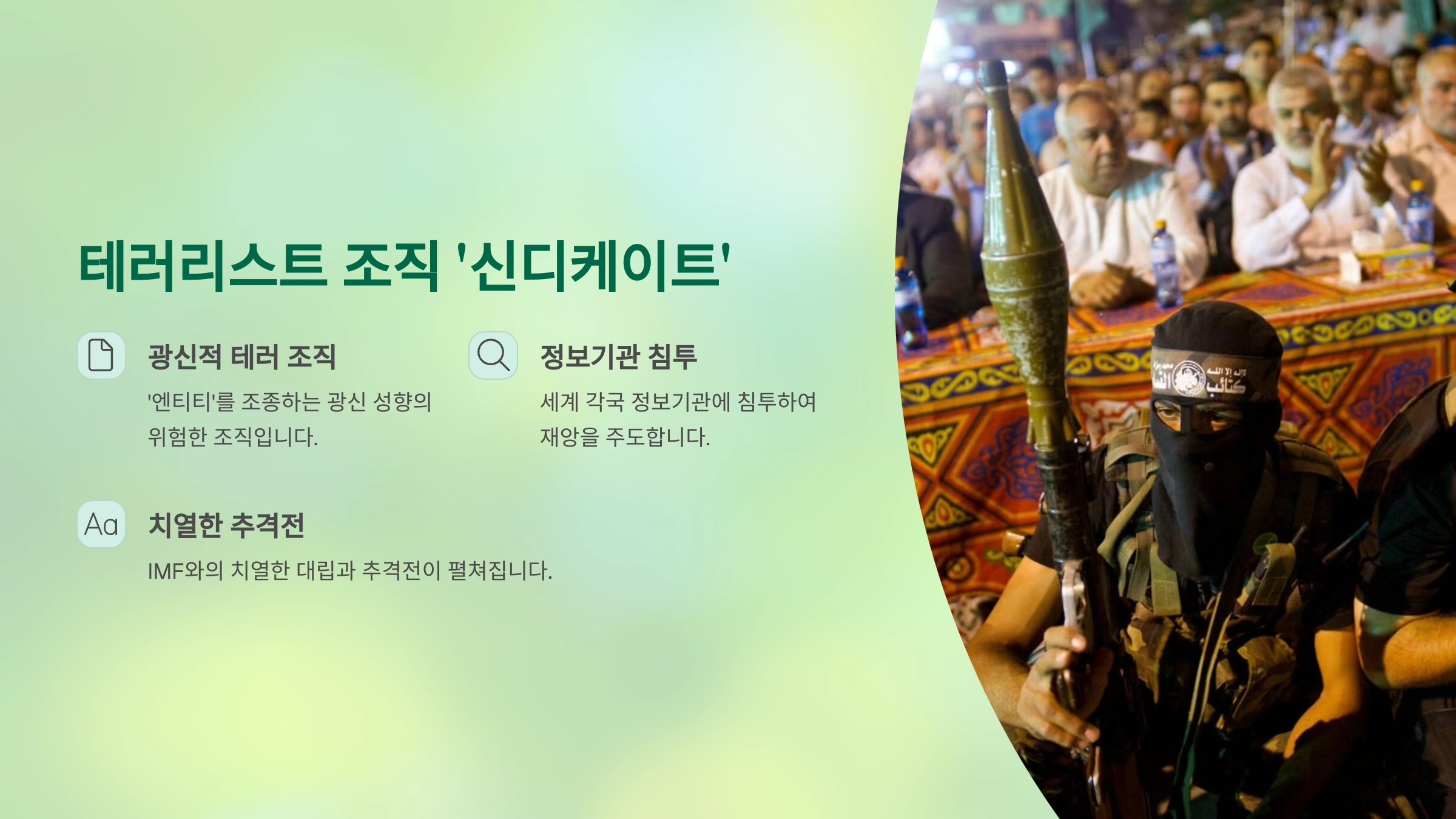 이들은 대담하게 플루토늄을 탈취하여 3개의 치명적인 핵폭탄을 제작합니다. 특히 아포슬이라는 인물이 이 계획에 가담하여 핵폭탄의 기술적 지원을 제공했습니다. 신디케이트 잔당은 에단 헌트에 대한 깊은 적대감을 품고 있으며, 그의 과거를 이용해 협박하는 전략을 사용합니다.