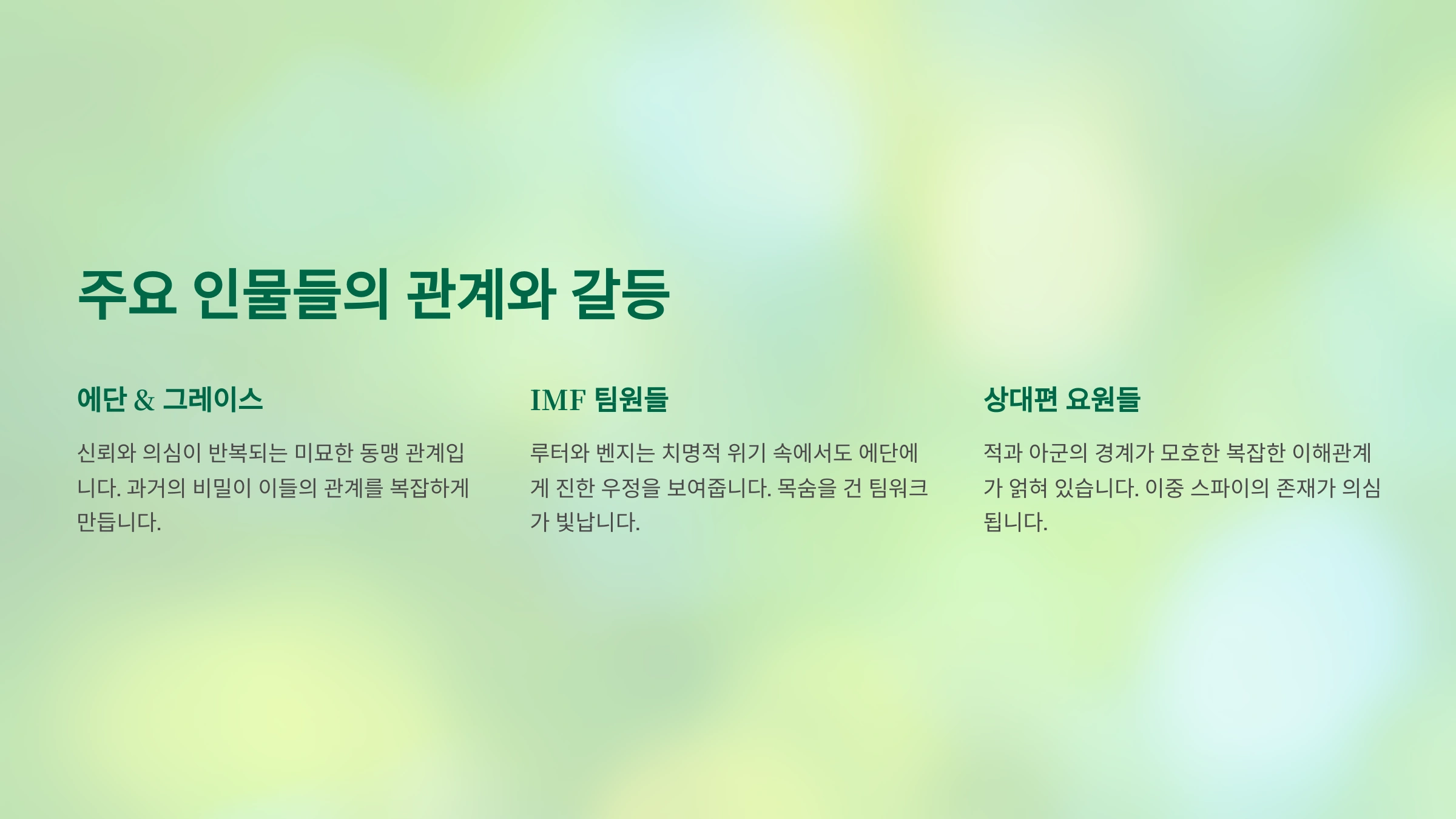 미션임파서블 파이널 레코닝에서는 이러한 인물 관계가 더욱 복잡하게 얽히며, 단순한 액션물을 넘어 인간 드라마로서의 깊이를 더합니다.