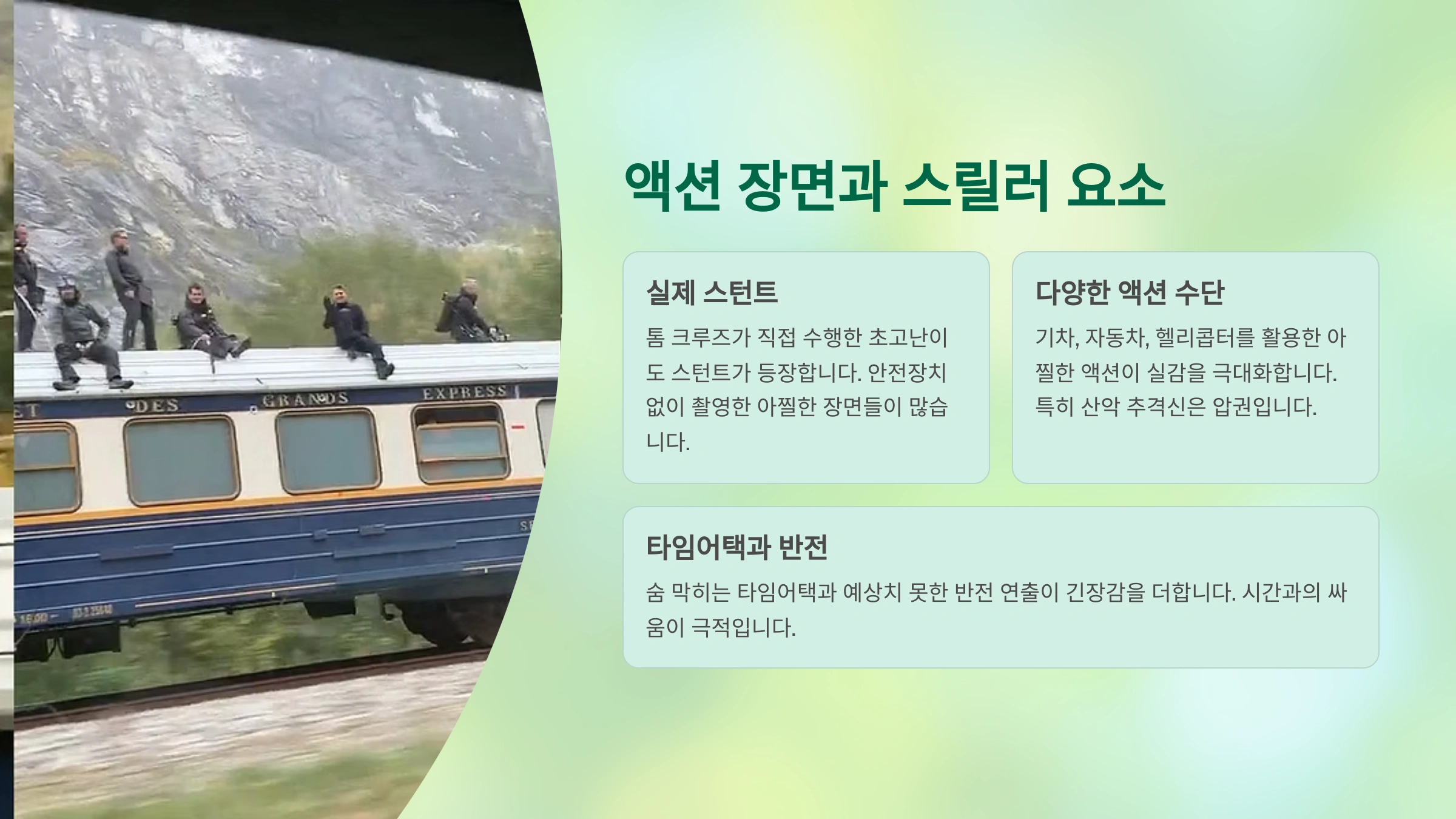 미션임파서블 파이널 레코닝은 전편보다 더 긴박하고 위험한 상황들을 연출하며, 에단 헌트의 대담한 스타일을 극대화했습니다. 이러한 액션과 스릴러 요소의 조화는 시리즈의 정체성을 강화하는 동시에 새로운 차원의 흥미를 더합니다.