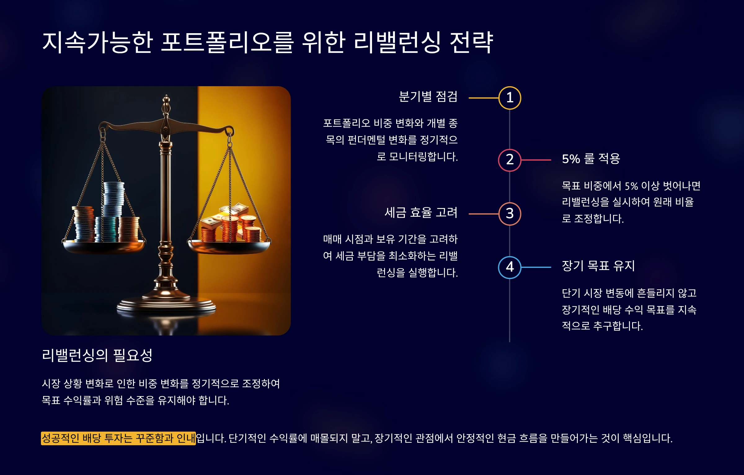 예를 들어, 주가가 많이 오른 배당성장주의 비중이 너무 커졌다면 일부를 이익 실현하고, 상대적으로 비중이 낮아진 고배당주를 추가 매수하여 원래의 비율(예: 40:60)을 맞추는 것입니다. 이를 통해 자연스럽게 '고점 매도, 저점 매수' 효과를 누리고, 포트폴리오의 위험을 안정적으로 관리할 수 있습니다. 1년에 한 번 또는 반기에 한 번씩 정기적으로 리밸런싱하는 것을 추천합니다.