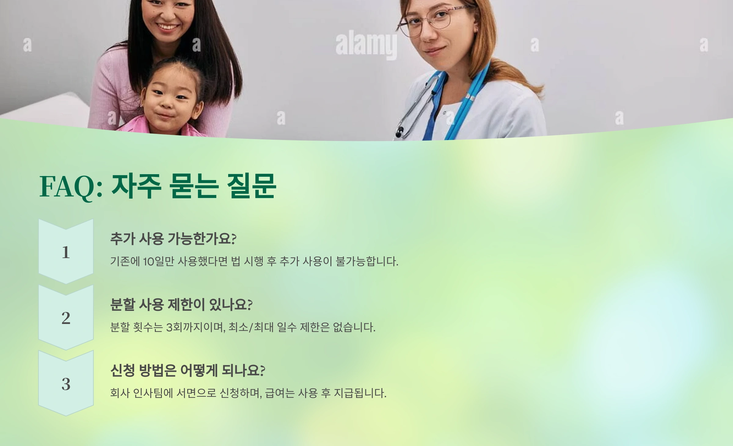 - 기간: 기존 연 3일(유급 1일 포함)에서 연 6일(유급 2일 포함)로 확대