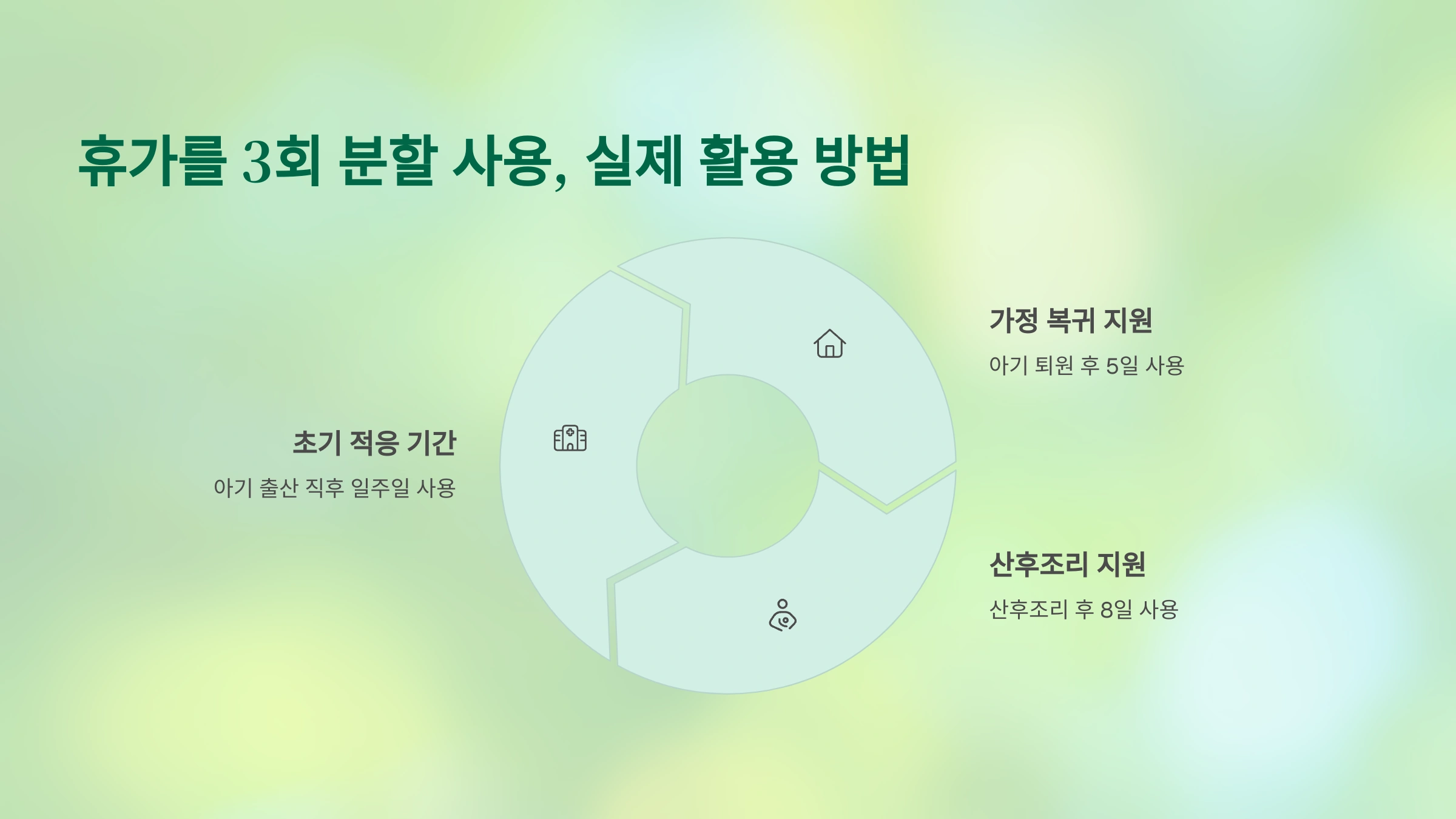 이러한 분할 사용 제도는 가정과 직장 상황에 맞게 휴가를 조정할 수 있어 매우 실용적입니다. 다만, 분할 사용 시에도 출산휴가 법정기준에 따라 총 20일을 120일 이내에 모두 사용해야 하며, 분할 횟수는 3회를 초과할 수 없다는 점을 기억해야 합니다.