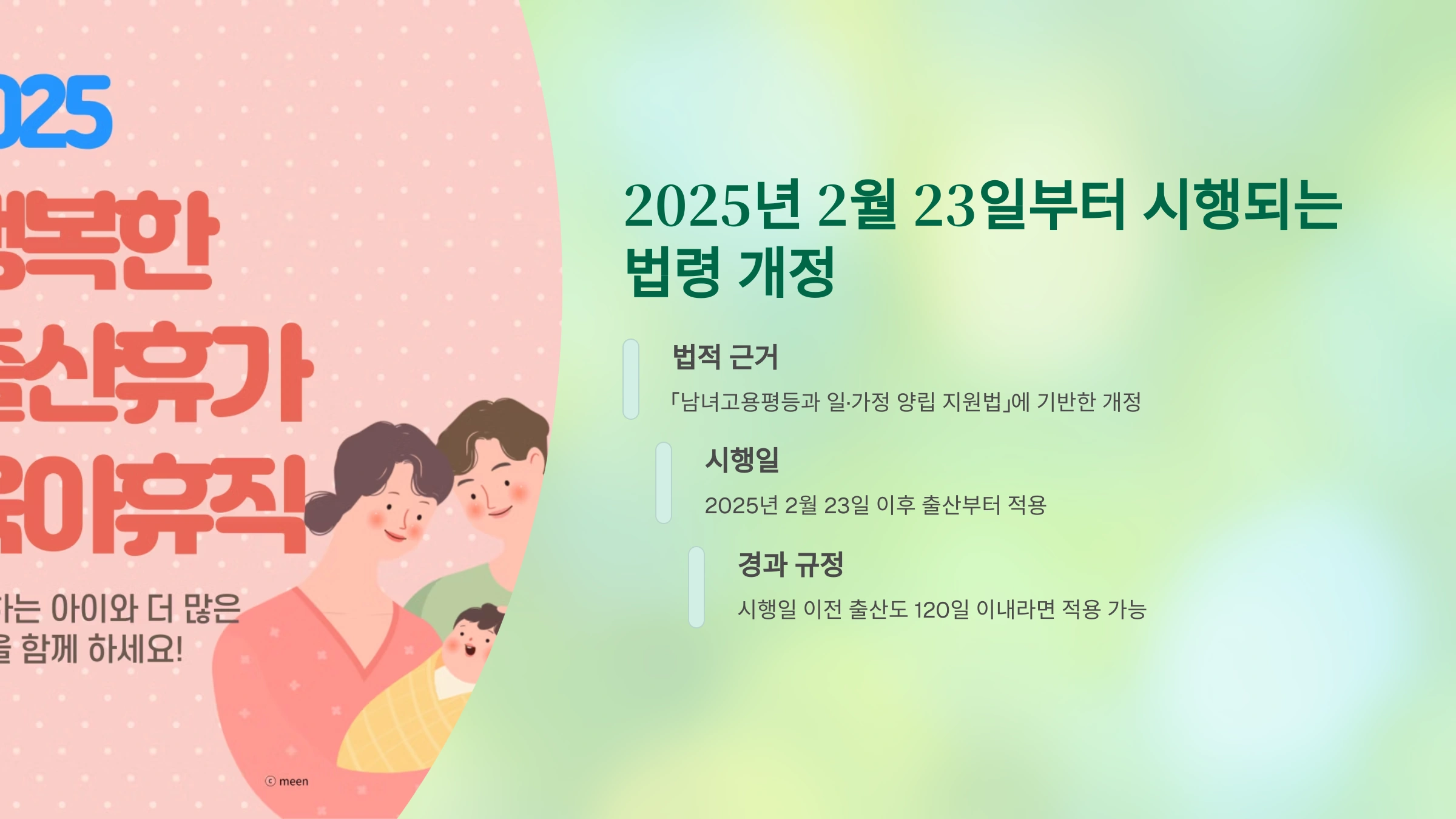 「남녀고용평등과 일·가정 양립 지원에 관한 법률」의 개정으로 새로운 출산휴가 법정기준이 2025년 2월 23일부터 시행됩니다. 이 개정된 법령은 시행일 전후 출산 가정에도 공정하게 적용될 수 있도록 소급 적용 조항을 포함하고 있습니다.