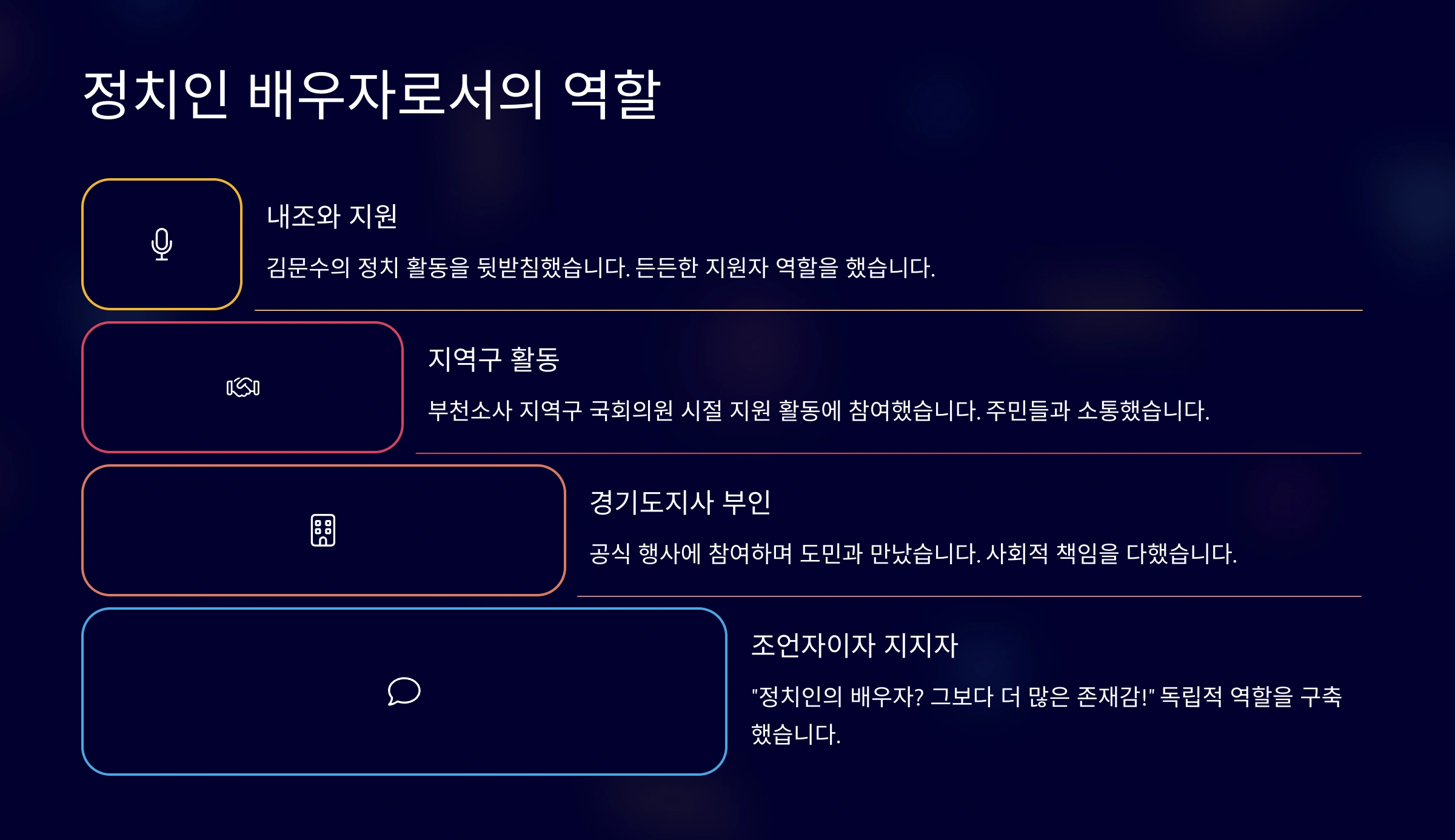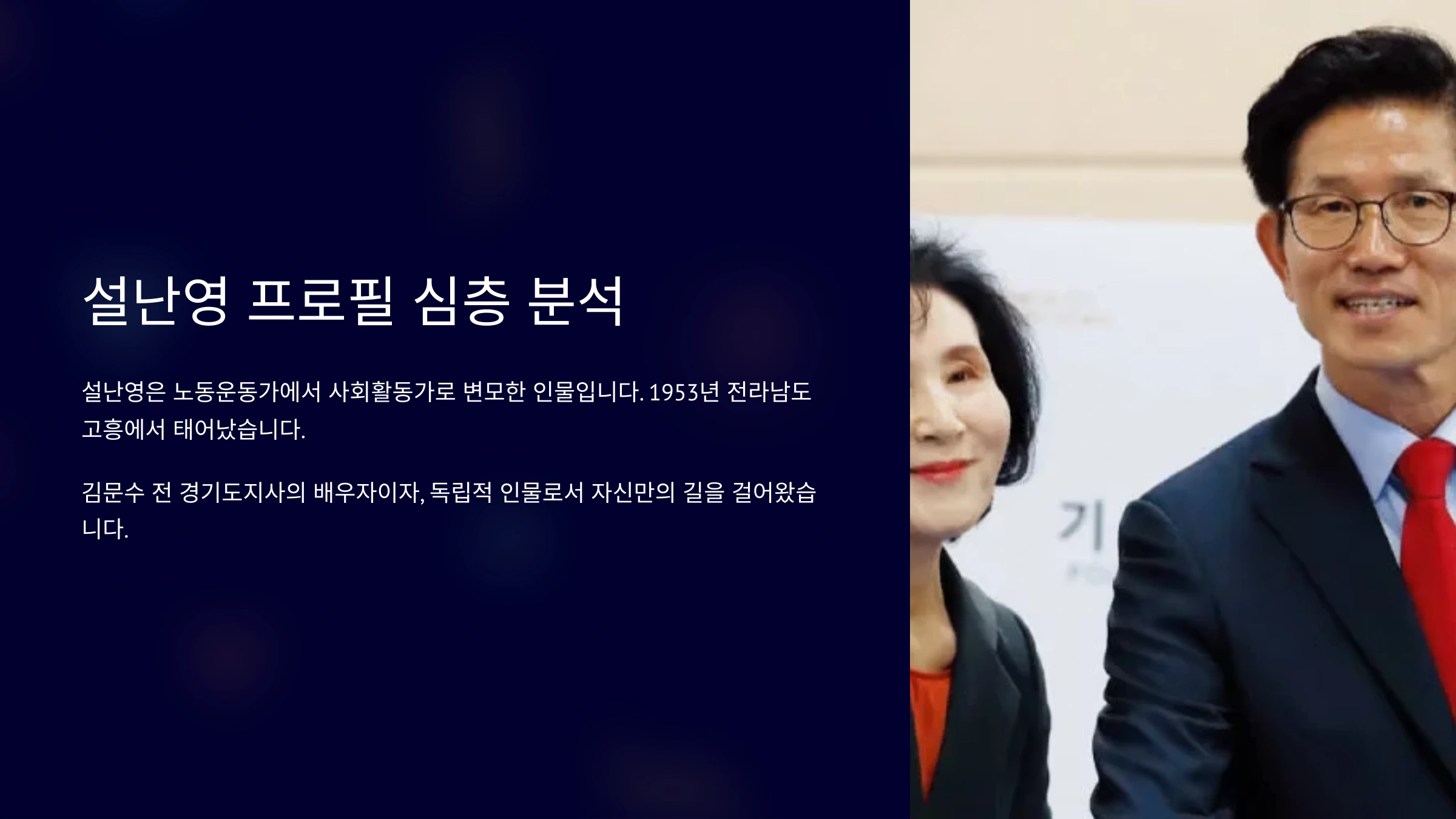 설난영은 김문수 후보의 배우자로서 정치 활동을 지원하는 내조 역할을 수행해왔습니다. 그러나 그녀의 역할은 단순한 내조를 넘어, 자신의 경험과 전문성을 바탕으로 여성 정책과 노동 문제에 대한 조언자로서의 면모도 보여주었습니다.