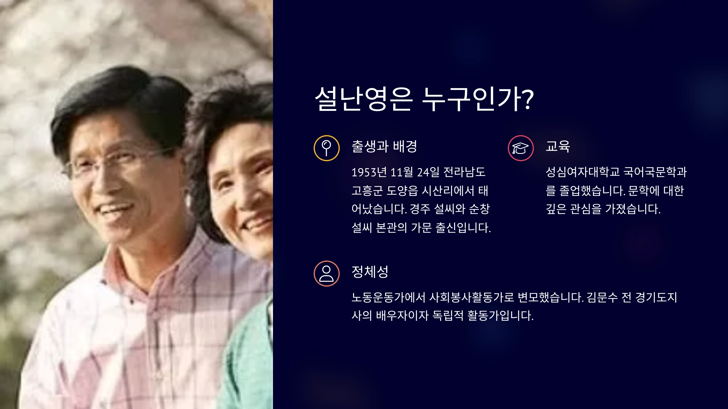 설난영(薛蘭寧, Seol Nan-young)은 1953년 11월 24일 전라남도 고흥군 도양읍 시산리에서 태어났습니다.