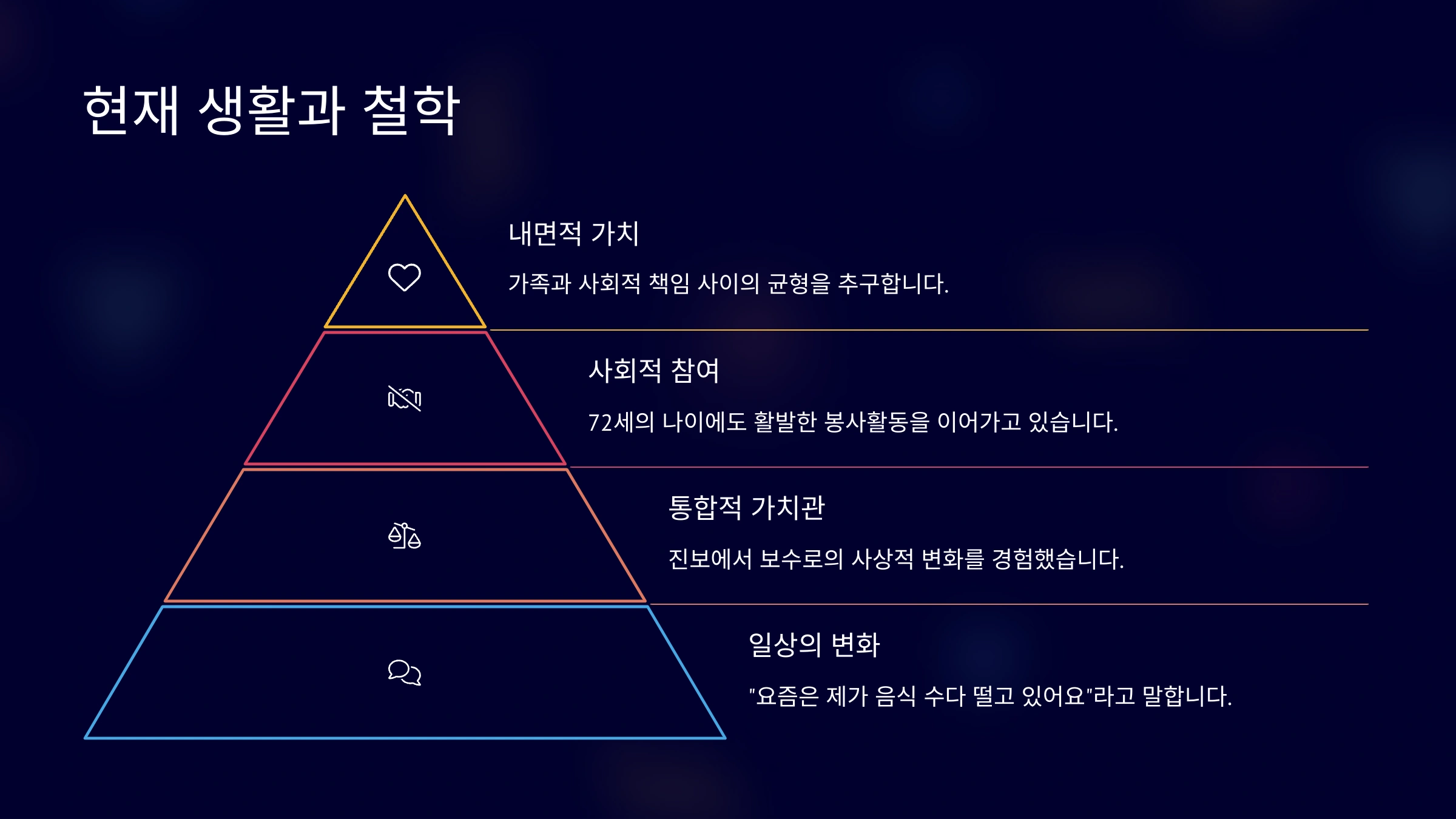 그녀의 철학은 "개인의 삶과 사회적 책임의 균형"에 중점을 두고 있습니다. 개인의 행복과 사회적 책임 사이에서 조화를 이루는 삶을 추구하며, 젊은 세대에게 사회 참여의 중요성을 강조하는 모습을 보이고 있습니다.