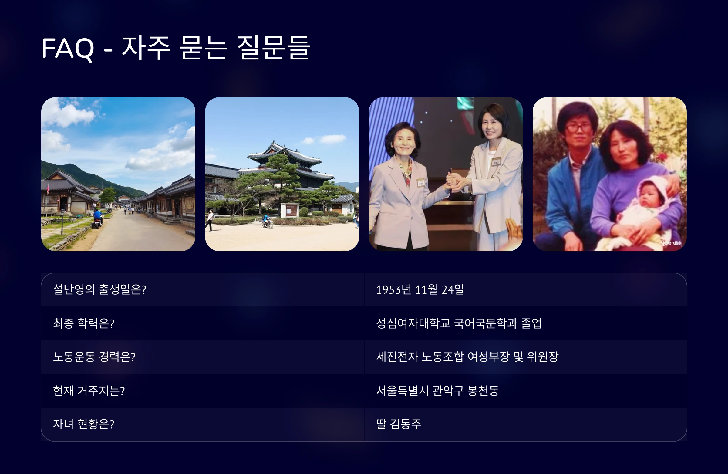 | 설난영의 철학은 무엇인가요? | "개인의 삶과 사회적 책임의 균형"을 중시하며, 특히 여성의 경제적 자립과 사회적 지위 향상에 관심을 두고 있습니다. |