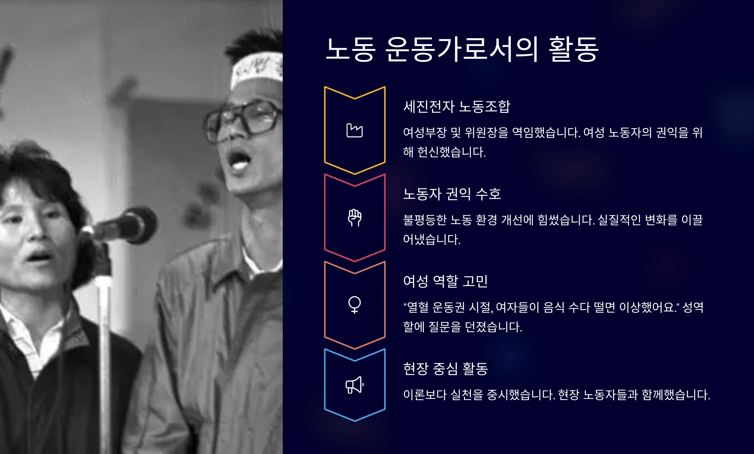 그녀의 인생은 한국 현대사의 굵직한 변화들과 함께했으며, 특히 여성 권익 신장과 노동 운동 분야에서 중요한 발자취를 남겼습니다.