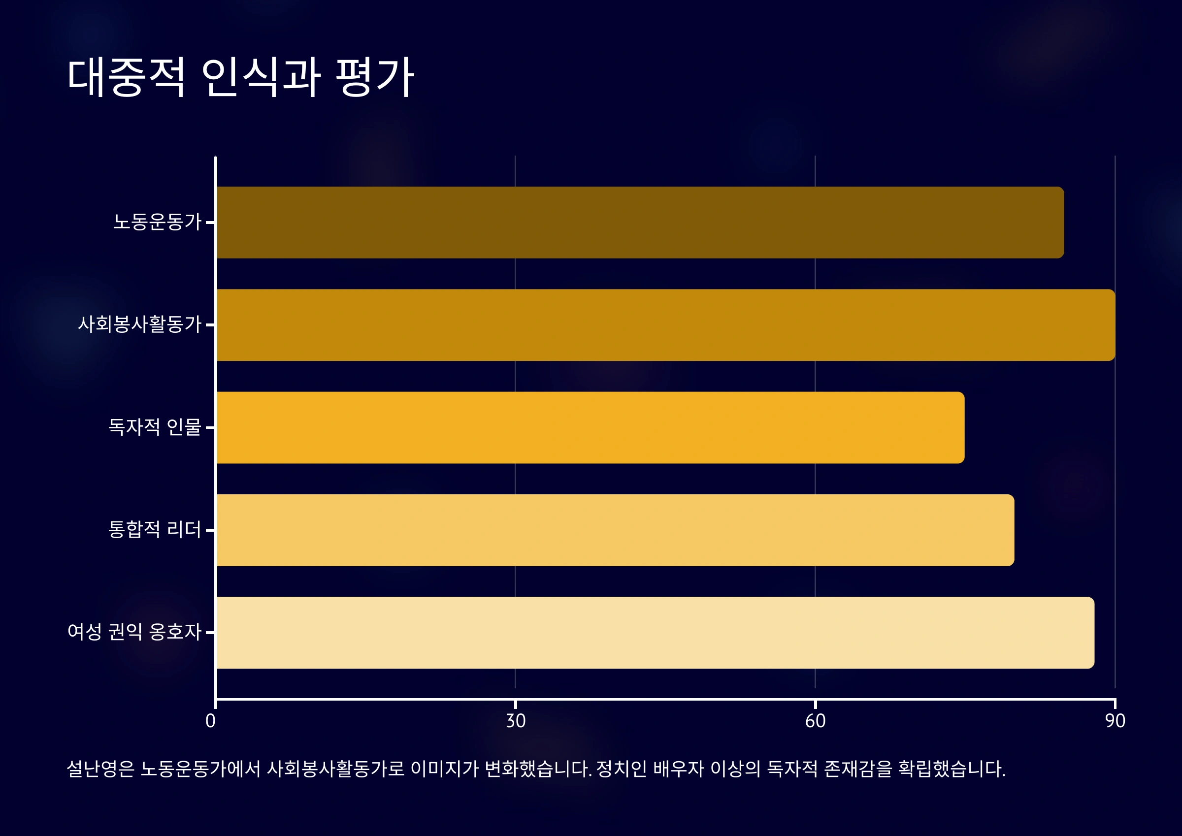 대중은 설난영을 단순히 "정치인의 아내"가 아닌 "독립적인 인물"로 인식하는 경향이 있습니다. 과거 노동 운동가와 현재의 사회 활동가로서의 이중적 정체성은 그녀를 특별하게 만드는 요소입니다.