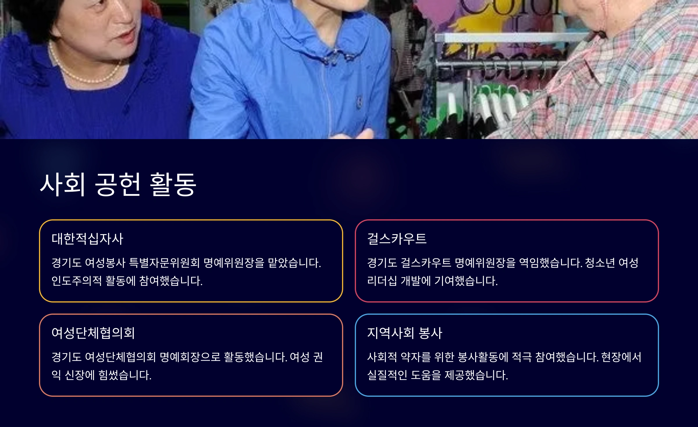 | 경기도 여성단체협의회 명예회장 | 여성 권익 증진 및 정책 제안 활동 |
