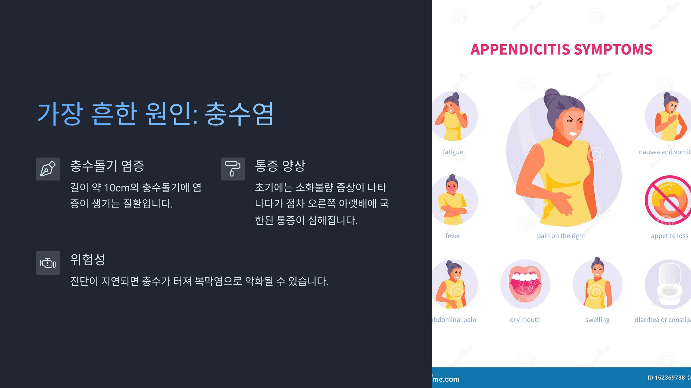 오른쪽 아랫배 통증의 대표적 원인으로 충수염을 꼽을 수 있습니다. 소장 말단에 위치한 충수돌기에 염증이 생기는 질환으로, 초기에는 명치 부위에서 통증이 시작되다가 점차 오른쪽 아랫배로 통증이 집중됩니다.