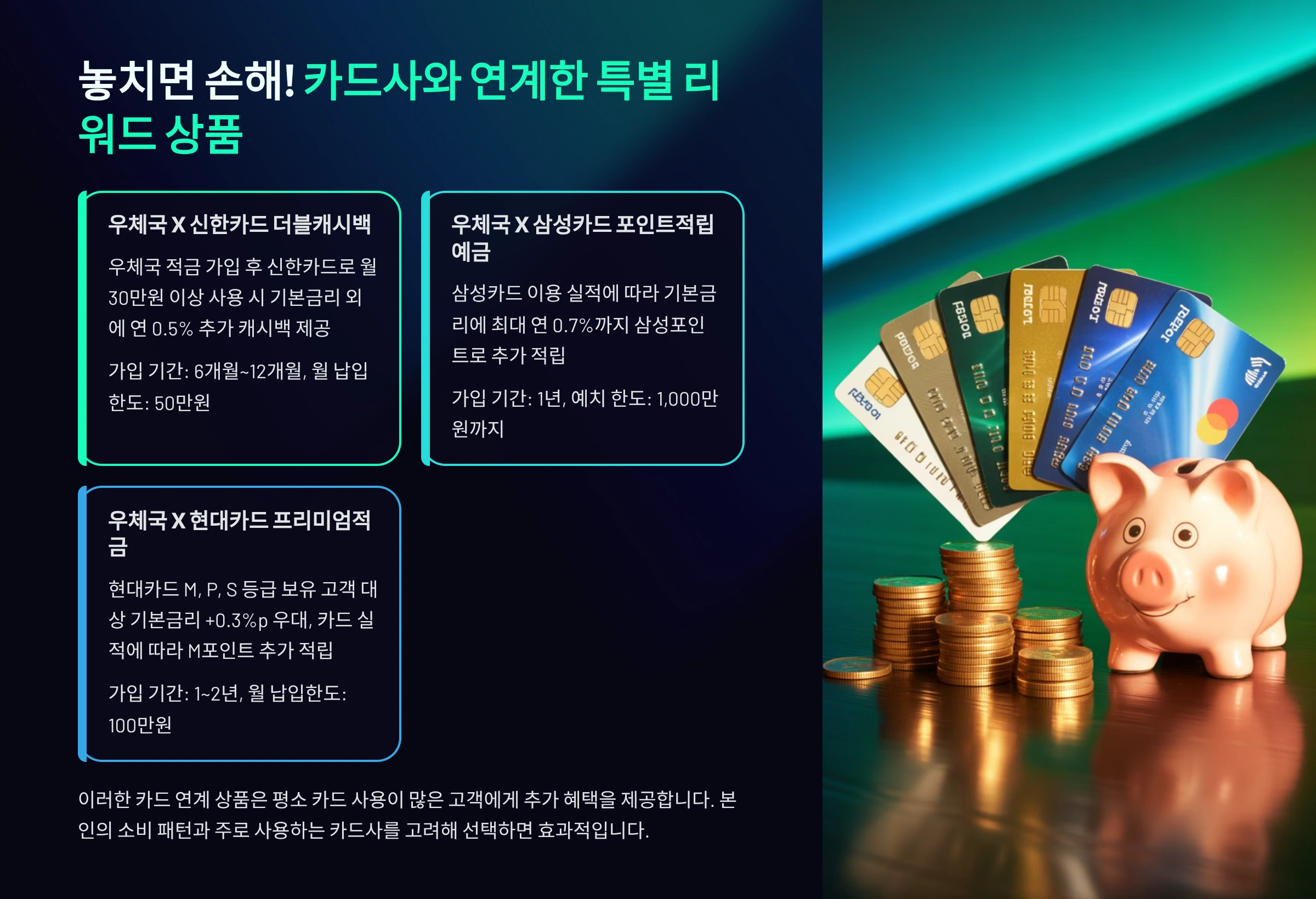 우체국은 자체 금리가 상대적으로 낮은 점을 보완하기 위해, 신한카드 등 카드사와 제휴하여 특별 리워드(캐시백)를 제공하는 이벤트를 상시적으로 진행합니다. 금리 효과로 환산하면 시중은행보다 훨씬 높은 수익을 얻을 수 있습니다.