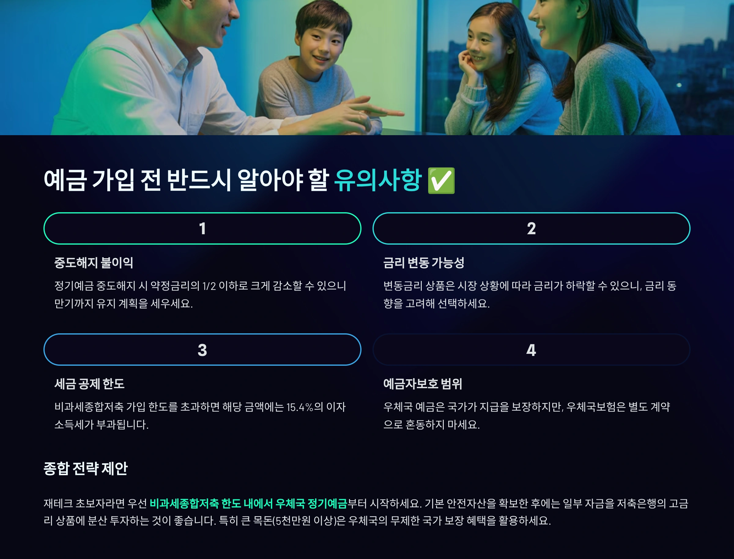이 글에 언급된 금융상품의 금리 및 조건은 2025년 9월 3일 기준으로 작성되었으며, 시장 상황에 따라 언제든지 변동될 수 있습니다. 본 내용은 일반적인 정보 제공을 목적으로 하며, 특정 상품의 가입을 권유하는 것이 아닙니다. 금융상품 가입 전 반드시 우체국 예금보험의 최신 공시 정보와 상품설명서, 약관을 확인하시기 바랍니다. 모든 투자의 최종 결정과 책임은 투자자 본인에게 있습니다.