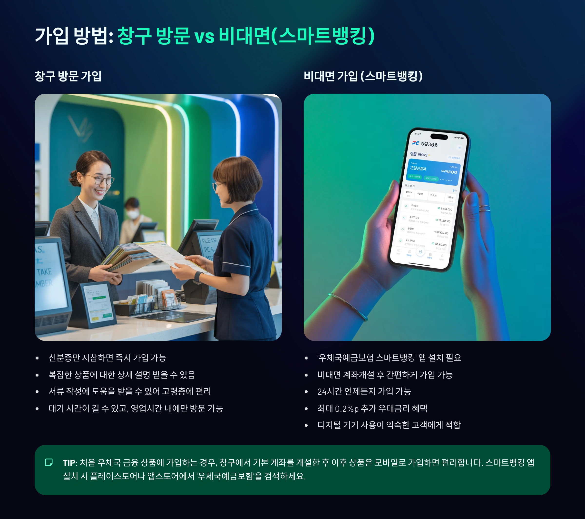 - 비대면 가입: '우체국 스마트뱅킹' 앱이나 인터넷뱅킹을 통해 24시간 언제든 가입할 수 있습니다. 대부분의 비대면 전용 상품은 추가 우대금리를 제공하므로 더 유리합니다.