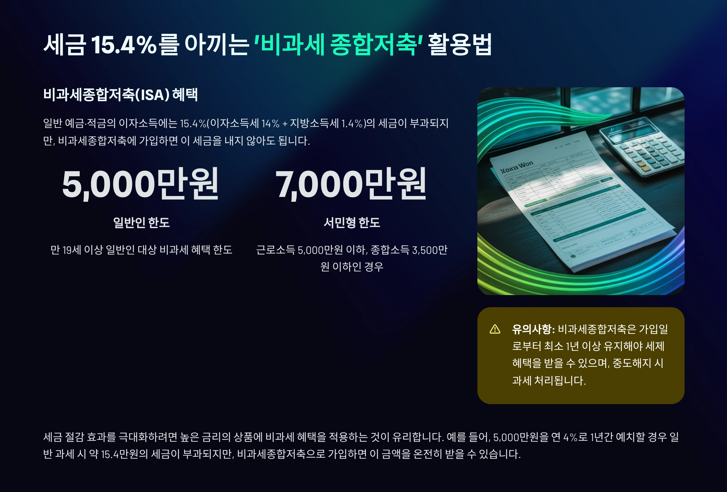 예금 이자에는 15.4%(소득세 14% + 지방소득세 1.4%)의 세금이 부과됩니다. 하지만 특정 자격 요건을 갖춘 경우, 이 세금을 면제받는 '비과세 종합저축'으로 가입할 수 있습니다.