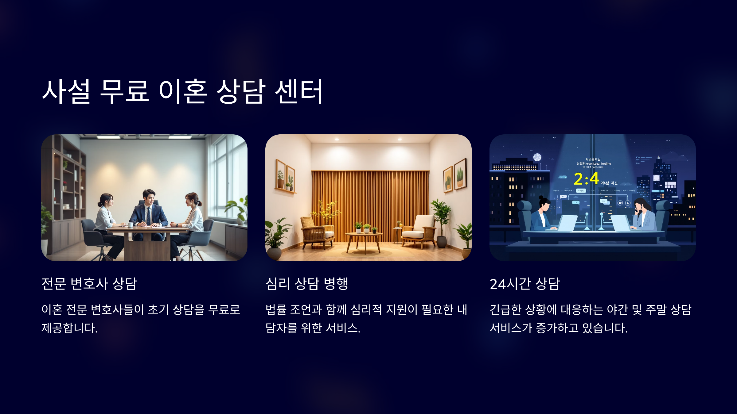 이혼 전문 변호사가 운영하는 사설 상담 센터에서도 무료 상담 서비스를 제공하고 있습니다. 이러한 센터들은 소송 이혼 절차, 재산 분할 방법, 양육권 분쟁 등 이혼 과정의 세부적인 사항에 대해 전문적인 조언을 제공합니다.