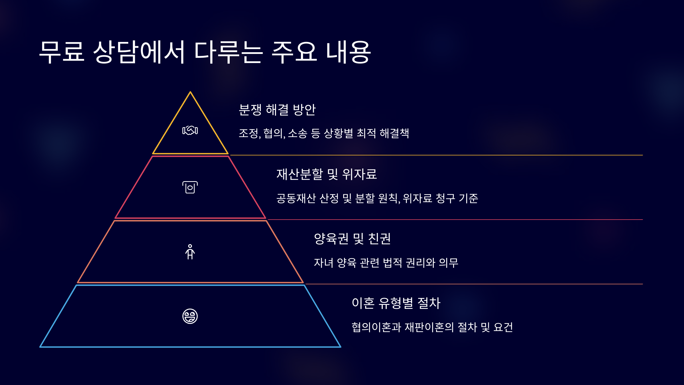 이혼 관련 상담에서는 소송 서류 작성법부터 재산 분할 방식, 양육권 분쟁 해결책까지 구체적인 도움을 받을 수 있습니다. 특히 민사 사건인 이혼의 경우, 일정 소득 기준을 충족하면 무료 변호 서비스까지 지원받을 수 있다는 점이 큰 장점입니다.