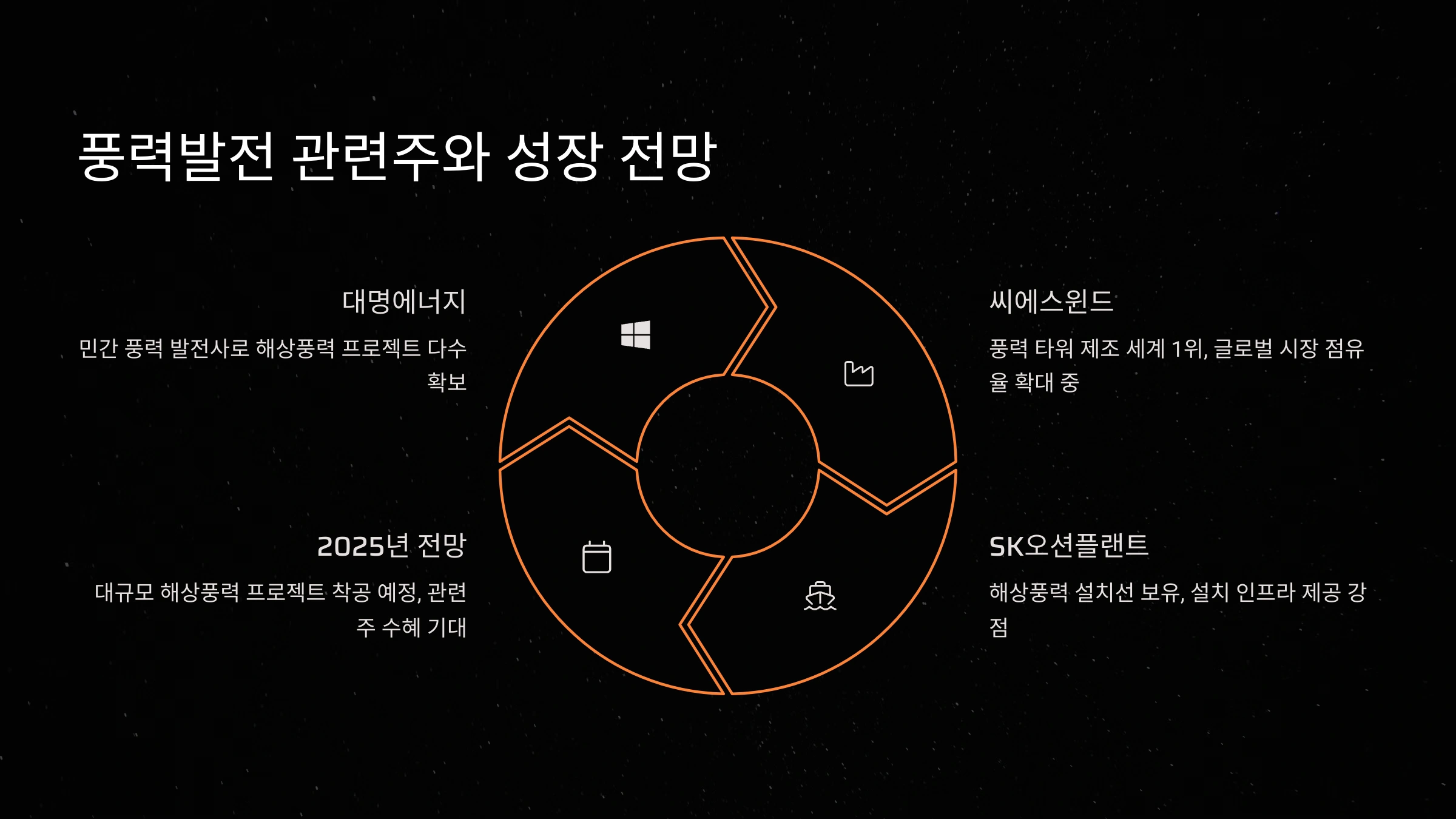 | 동국S&C | 풍력 구조물 제작 | 해상풍력 구조물 제작 전문, 정부의 해상풍력 확대 정책 수혜 예상 |
