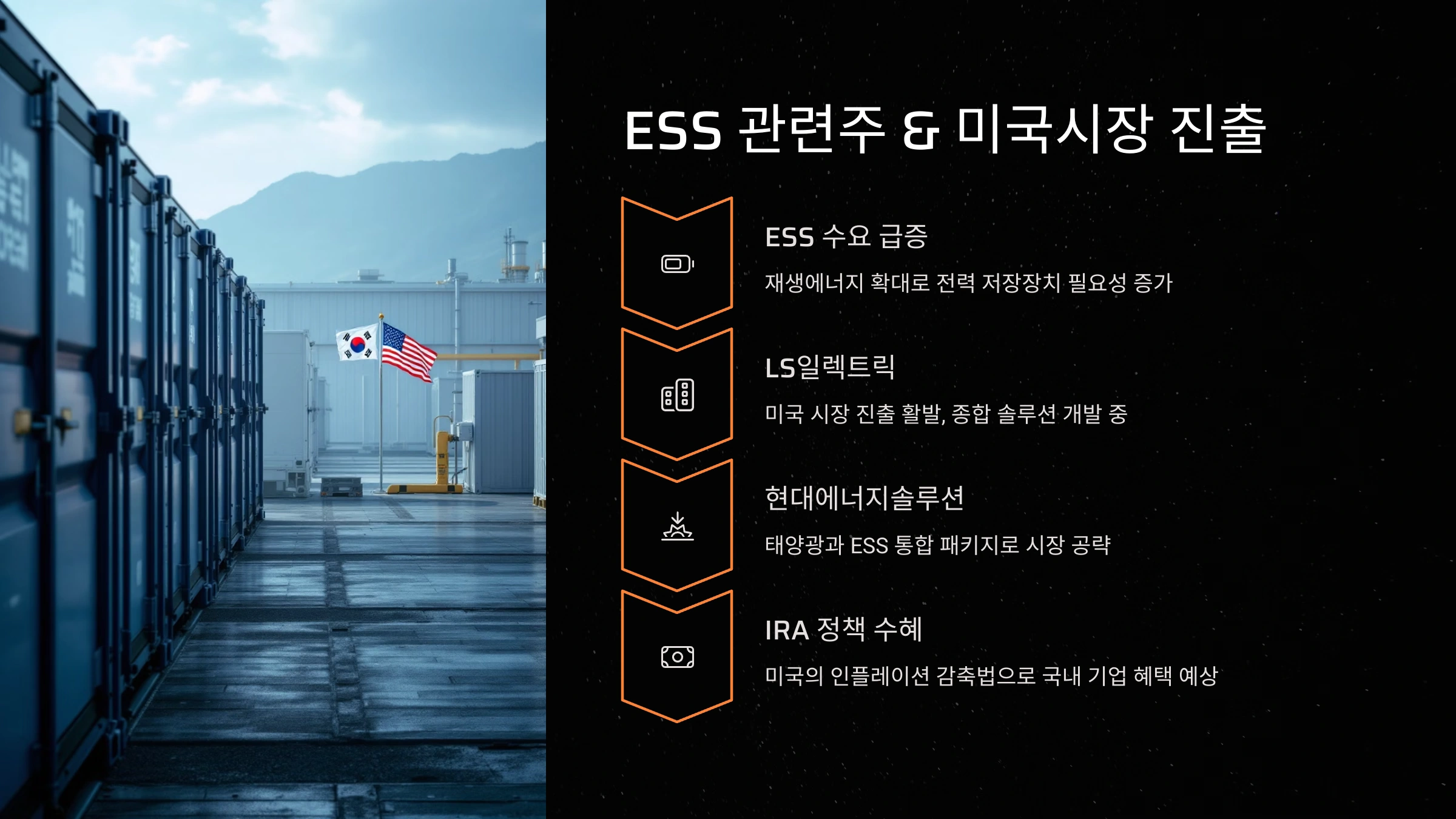 ESS(에너지 저장 시스템)는 재생에너지의 가장 큰 약점인 불규칙한 공급 문제를 해결하는 핵심 기술입니다. 이 분야에서 가장 주목받는 기업은 LS 일렉트릭으로, 이들은 재생에너지 솔루션을 개발해 미국 텍사스 등 해외 시장에 적극 진출하고 있습니다.