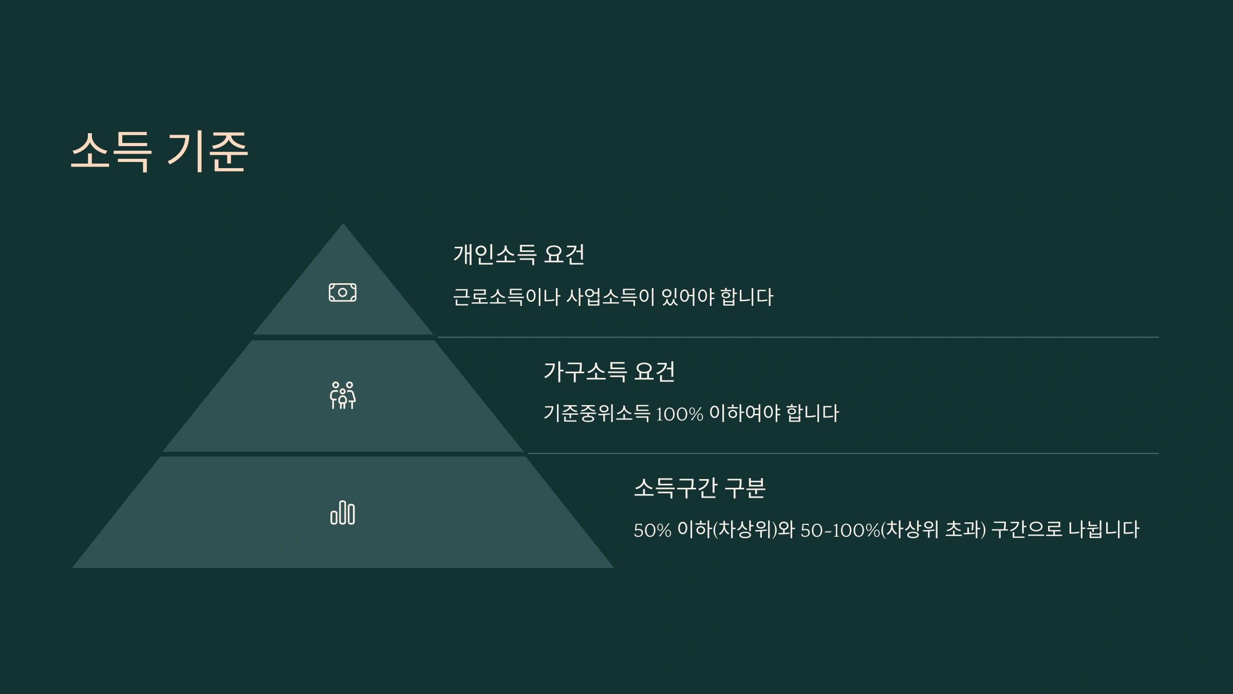 둘째, 중위소득 50% 초과~100% 이하에 해당하는 일반 청년은 월 50만 원 초과~250만 원 이하의 근로·사업 소득이 있어야 합니다. 1인 가구 기준으로는 월 소득이 223만 원 이하여야 합니다.