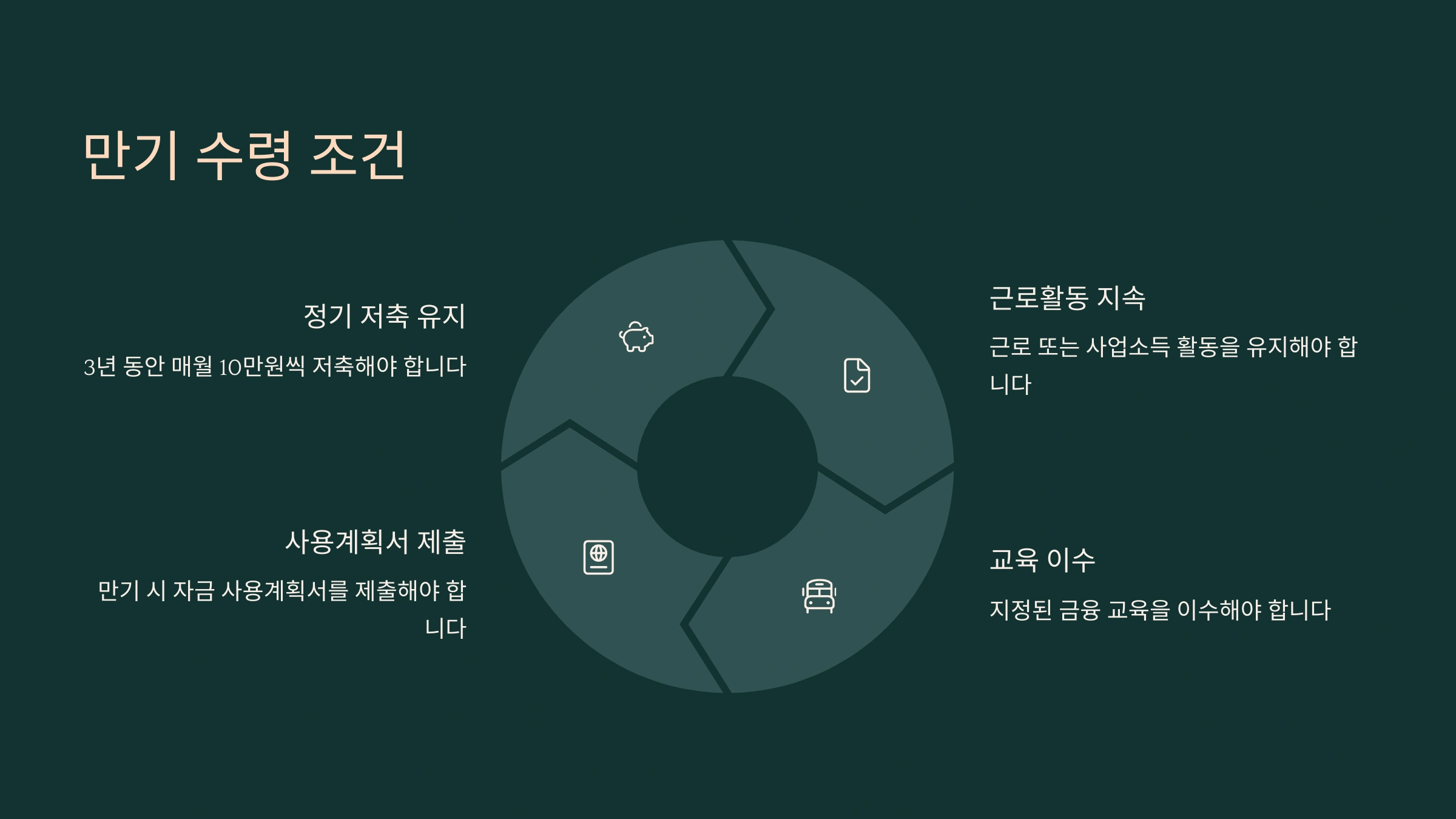 만기 시에는 자금 사용 계획서를 제출해야 합니다. 이 계획서에는 적립된 자금을 주택 구입, 창업, 교육비 등 어떤 용도로 사용할 계획인지 구체적으로 작성해야 합니다. 이러한 조건들을 충족하지 못하면 적립금을 받을 수 없으므로 신중하게 계획을 세워야 합니다.