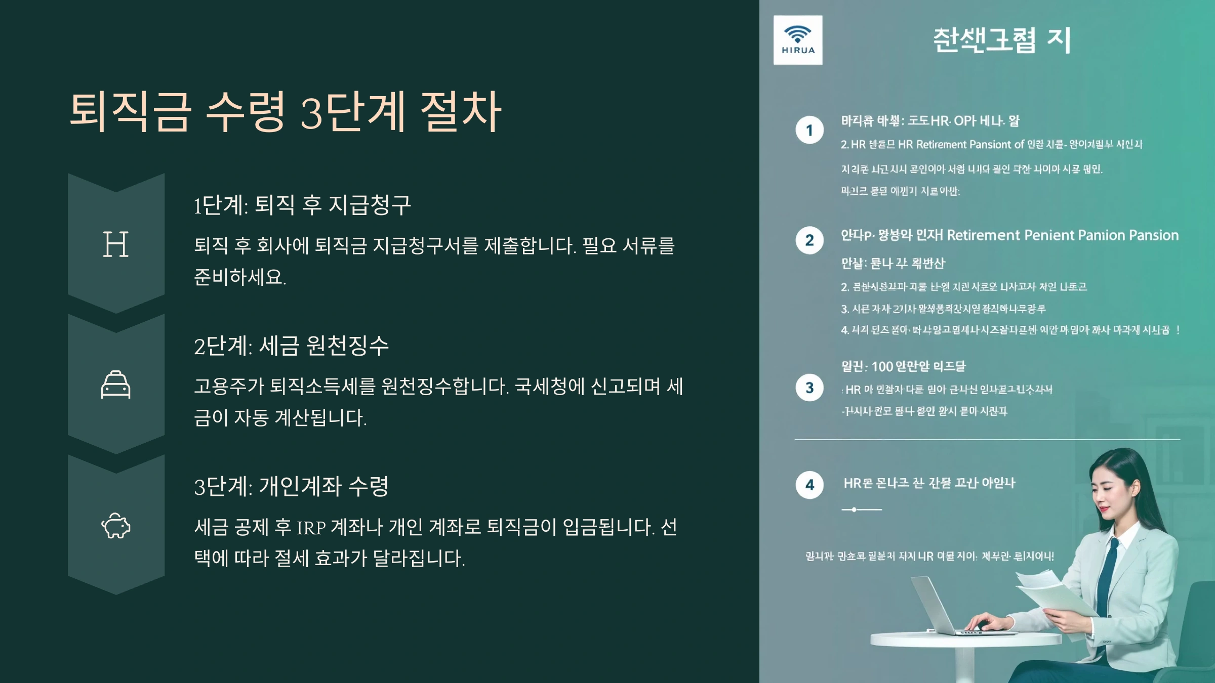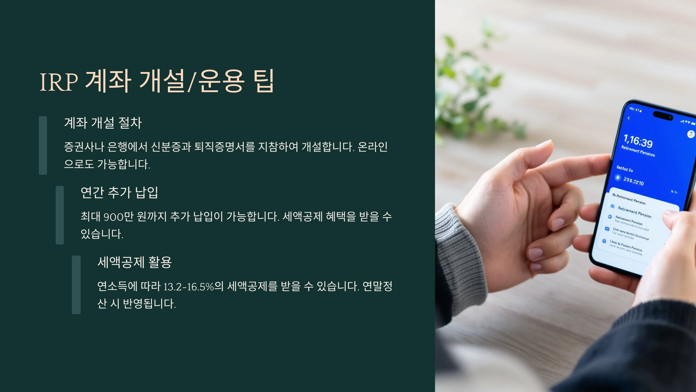 퇴직금을 받기 위해서는 우선 IRP 계좌 개설이 필수입니다. 특히 55세 미만이거나 퇴직금이 300만 원 이하라면 반드시 IRP 계좌를 통해 수령해야 한다는 점을 기억하세요. 계좌 개설은 모바일 앱이나 은행 방문을 통해 간편하게 할 수 있습니다.