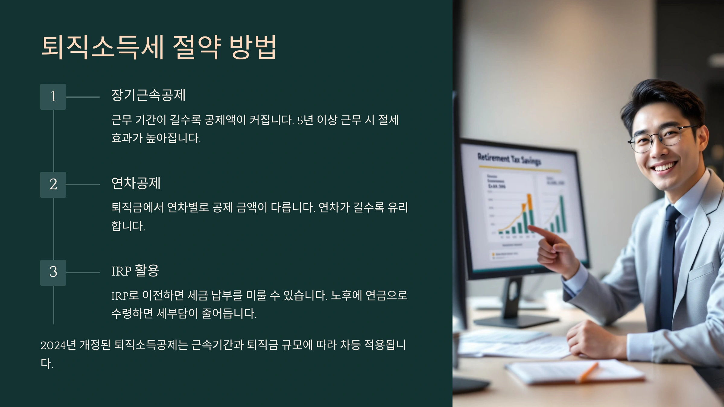 예를 들어, 퇴직금이 1억 원이라면 일시금으로 받을 경우 1억 원 전체에 세금이 적용됩니다. 하지만 연금으로 받으면 7,000만 원에만 세금이 부과되고, 3,000만 원에 대한 세금을 절약할 수 있습니다. 이는 상당한 금액의 절세 효과를 가져옵니다.