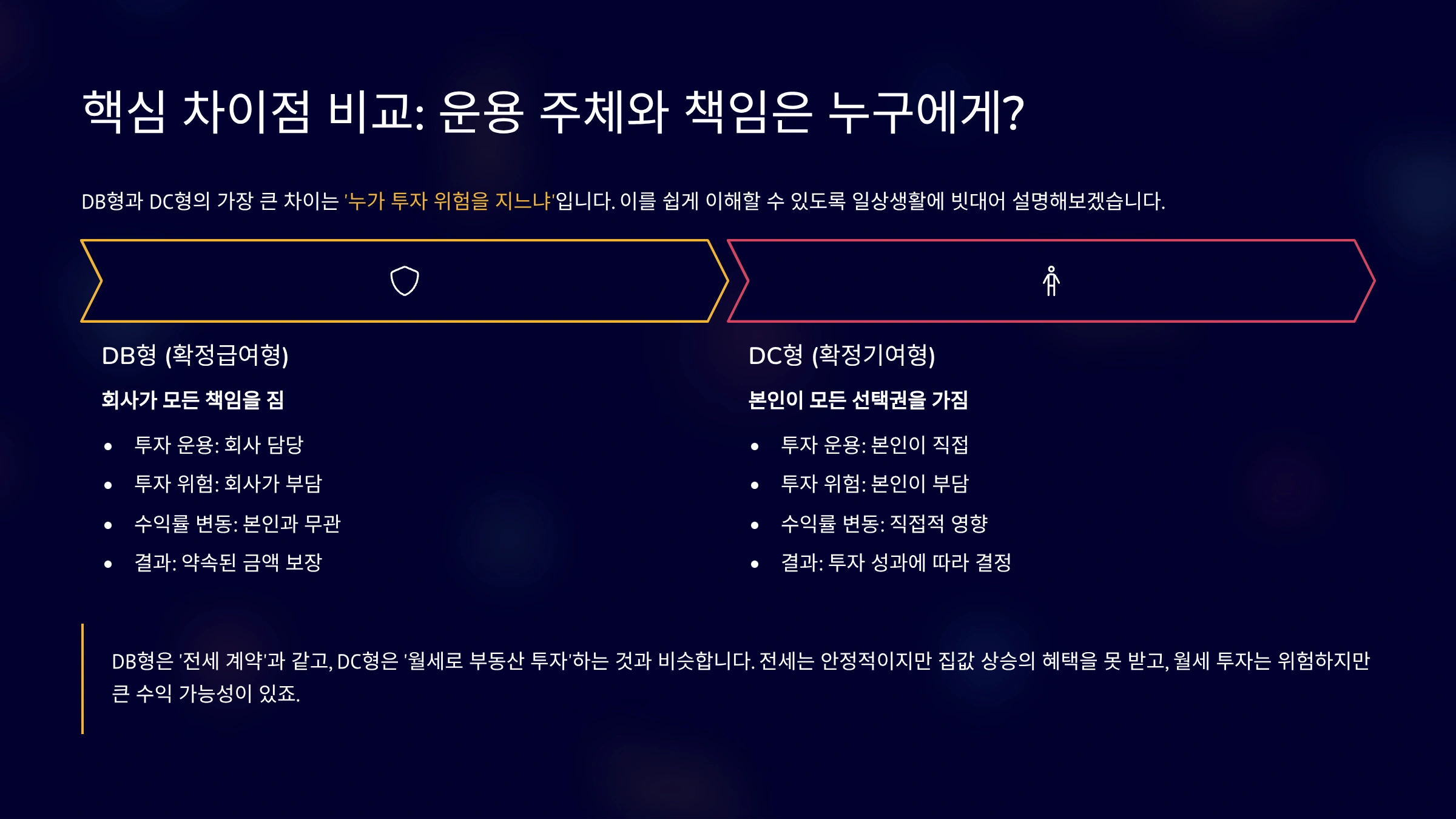 DB형과 DC형의 가장 근본적인 차이는 바로 '운용 주체'와 그에 따른 '책임'입니다. 아래 표를 통해 한눈에 비교해 보세요.