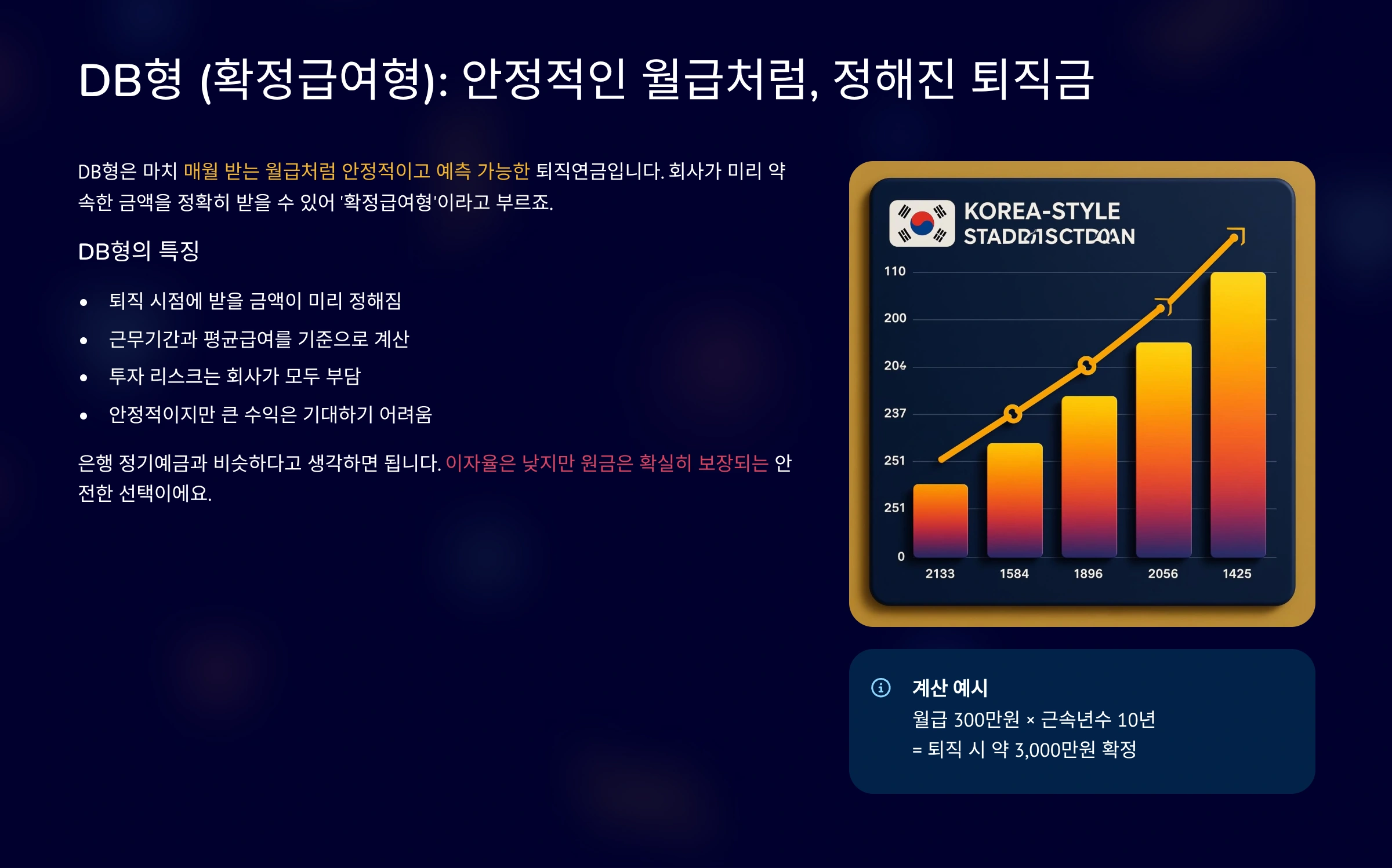 1. DB형 (확정급여형): 안정적인 월급처럼, 정해진 퇴직금 🏦