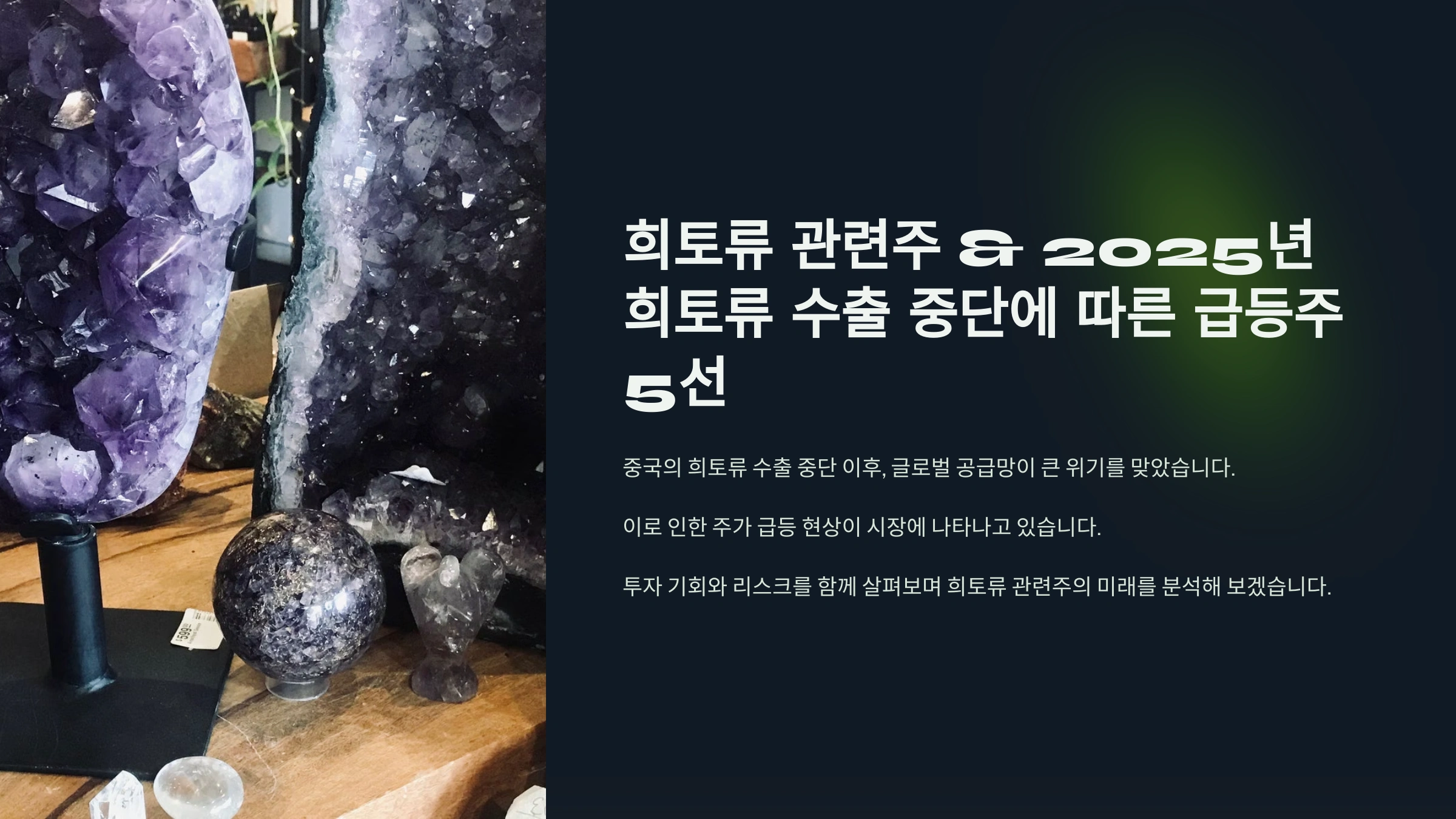 미중 무역 갈등이 극에 달하며 중국의 희토류 수출 중단 조치가 글로벌 시장에 큰 파장을 일으키고 있습니다. 이 상황에서 희토류 관련주에 대한 관심이 급증하고 있는데요, 희토류가 왜 중요한지, 그리고 이번 사태로 어떤 기업들이 주목받고 있는지 자세히 살펴보겠습니다.
