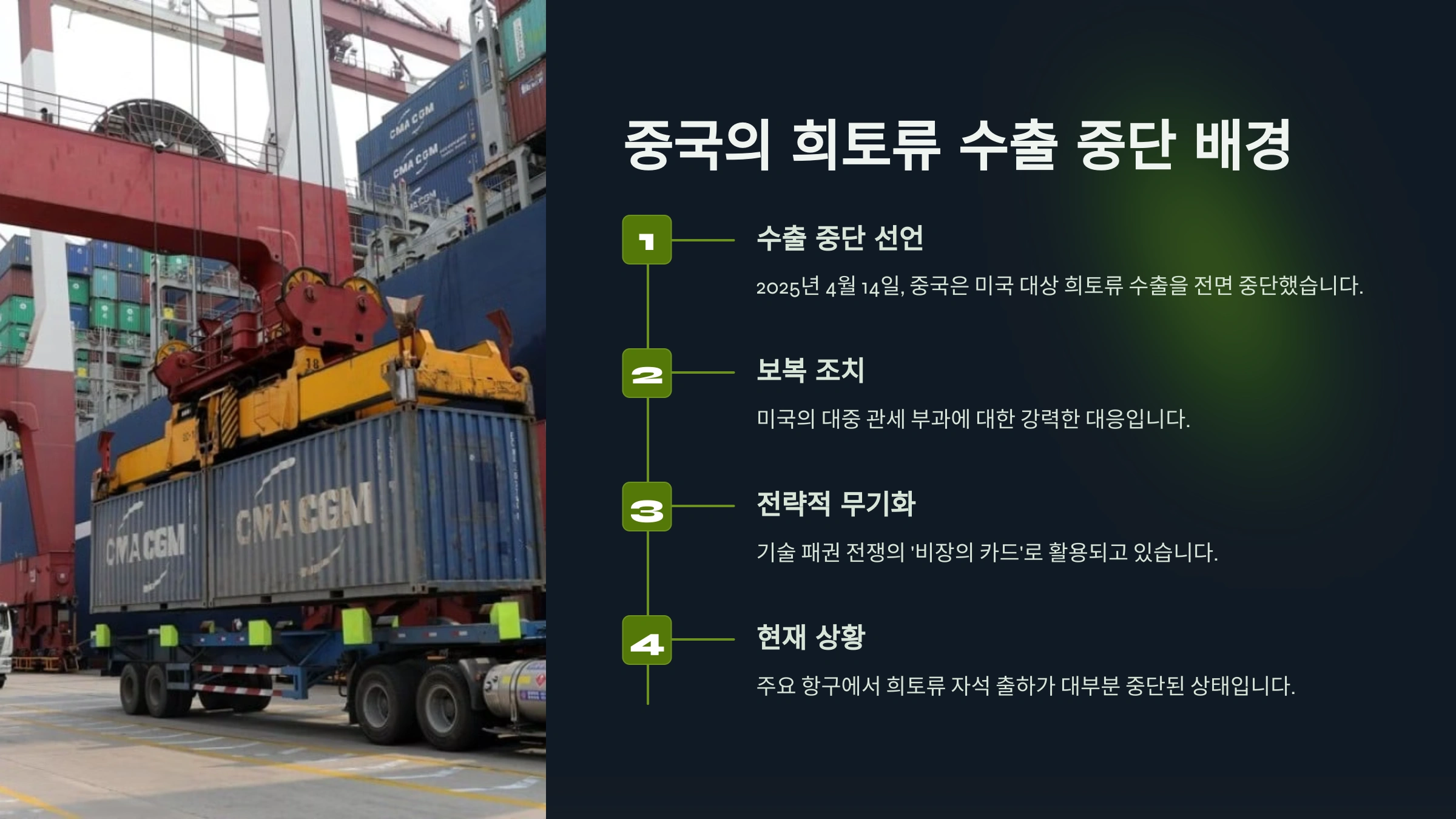 2025년 4월 14일, 중국 정부는 미국을 대상으로 희토류 광물 및 자석 수출을 전면 중단한다고 공식 발표했습니다. 이는 미국의 대중 관세 강화 조치에 대한 보복성 결정으로, 전 세계 산업계에 큰 충격을 주고 있습니다. 중국은 글로벌 희토류 정제 시장의 90% 이상을 장악하고 있어 이번 조치의 파급력이 상당합니다.