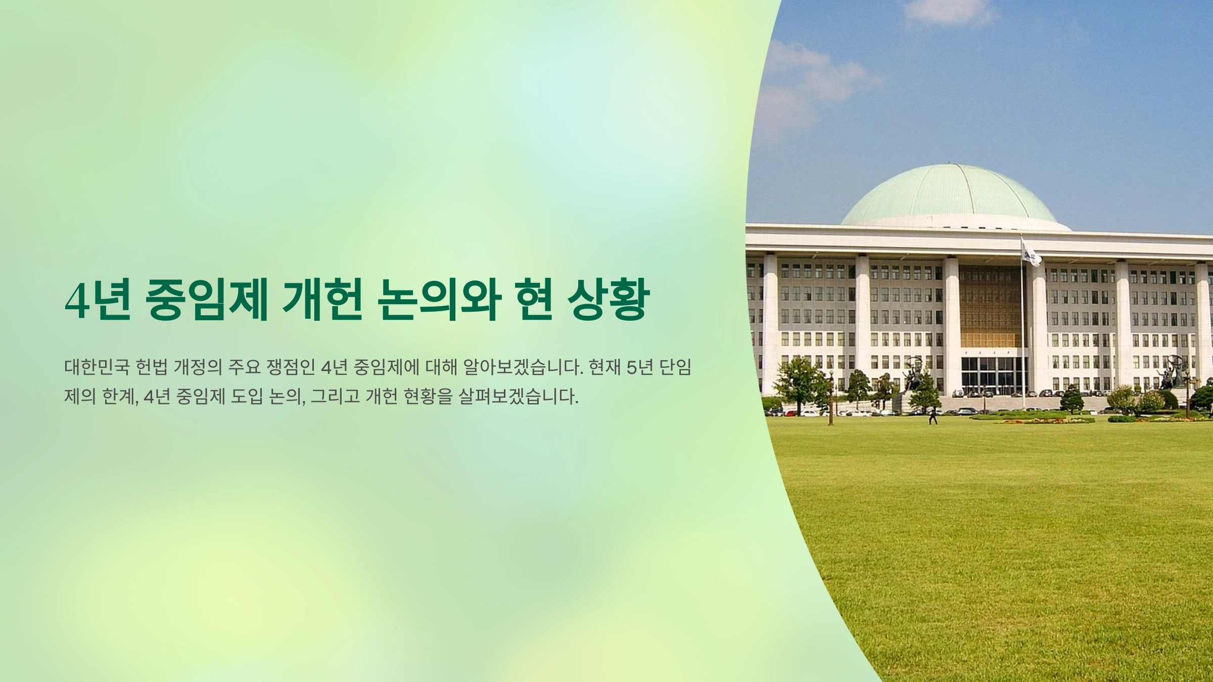 2025년 현재, 4년중임제 도입을 위한 헌법 개정 논의가 정치권에서 활발히 진행 중입니다. 여러 정당들이 국정 운영 효율성과 정책 지속성을 강조하며 개헌의 필요성을 주장하고 있습니다.