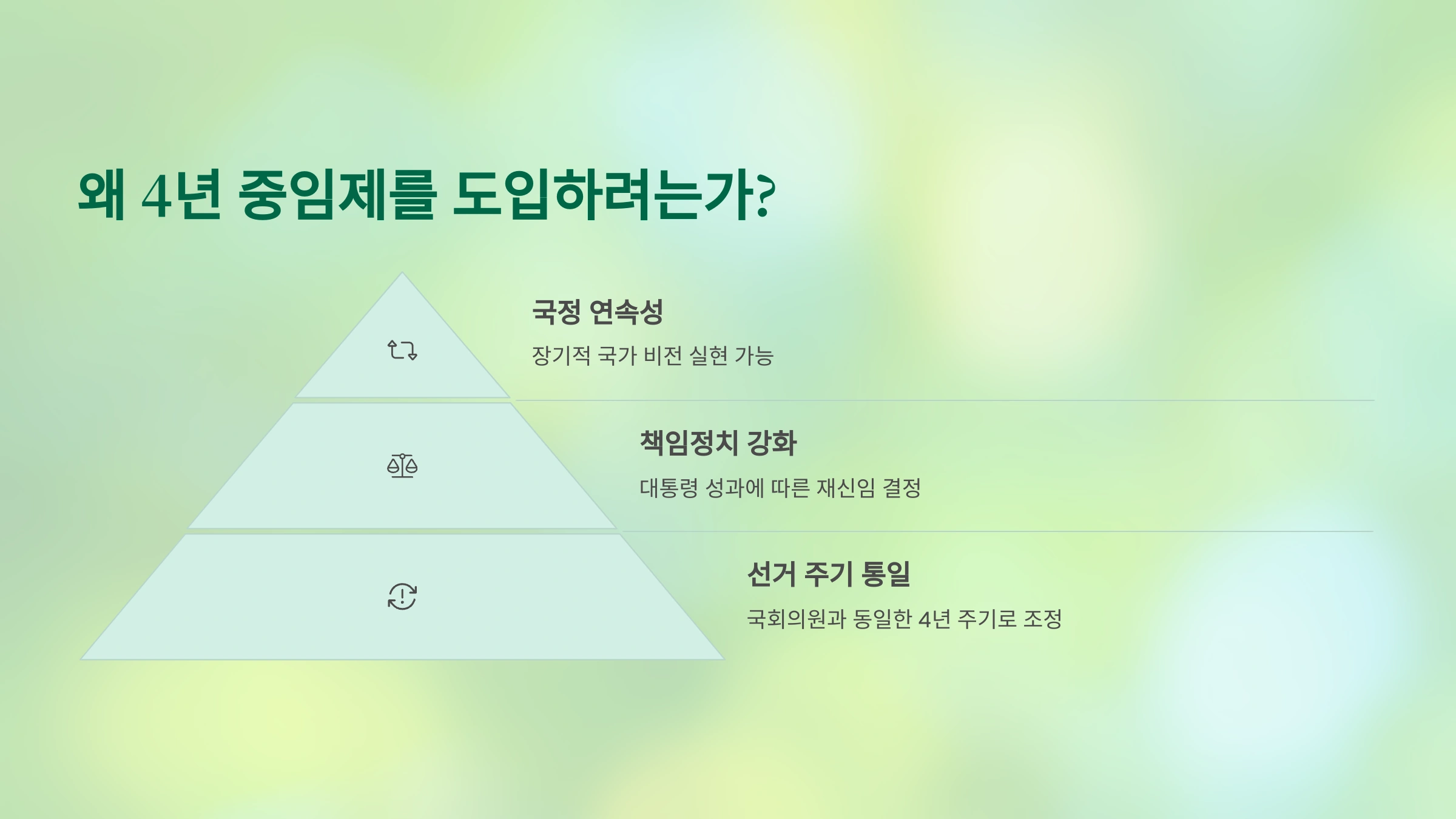 이 제도의 핵심 목적은 국정 운영의 연속성과 책임 정치를 강화하는 데 있습니다. 현재 우리나라는 5년 단임제를 시행하고 있어 대통령이 한 번 당선되면 다시 출마할 수 없습니다. 반면 4년중임제에서는 재선 가능성이 열려있어 대통령이 더 책임감 있게 국정을 운영할 동기가 생깁니다.