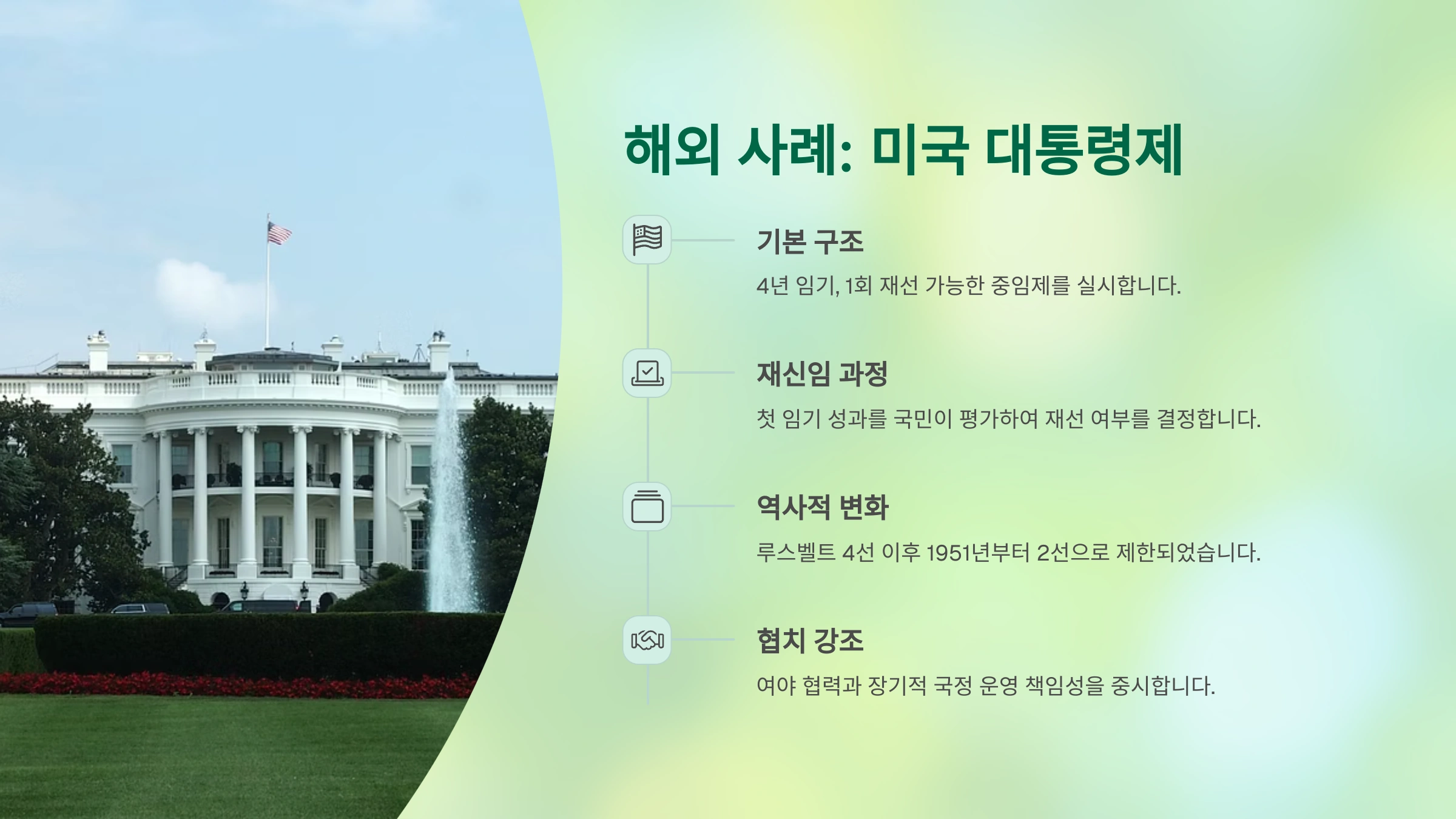 미국의 사례는 4년중임제가 정치적 안정성과 정책 연속성을 어떻게 보장할 수 있는지 보여주는 중요한 참고 사례입니다.