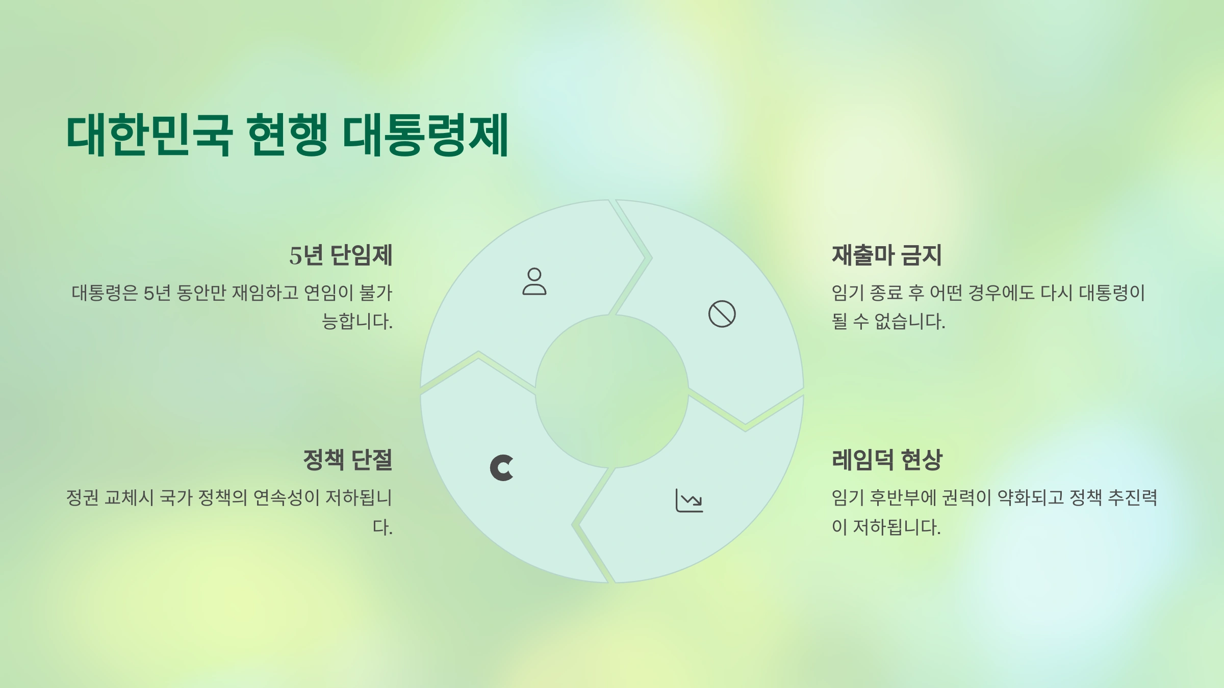 현행 제도에서는 대통령이 임기 초반에 강력한 개혁 정책을 추진하다가도, 임기 후반에는 지지율 하락과 함께 추진력을 잃는 패턴이 반복되어 왔습니다. 이로 인해 장기적 국가 발전 전략을 일관되게 추진하기 어려운 구조적 한계가 지적되고 있습니다.