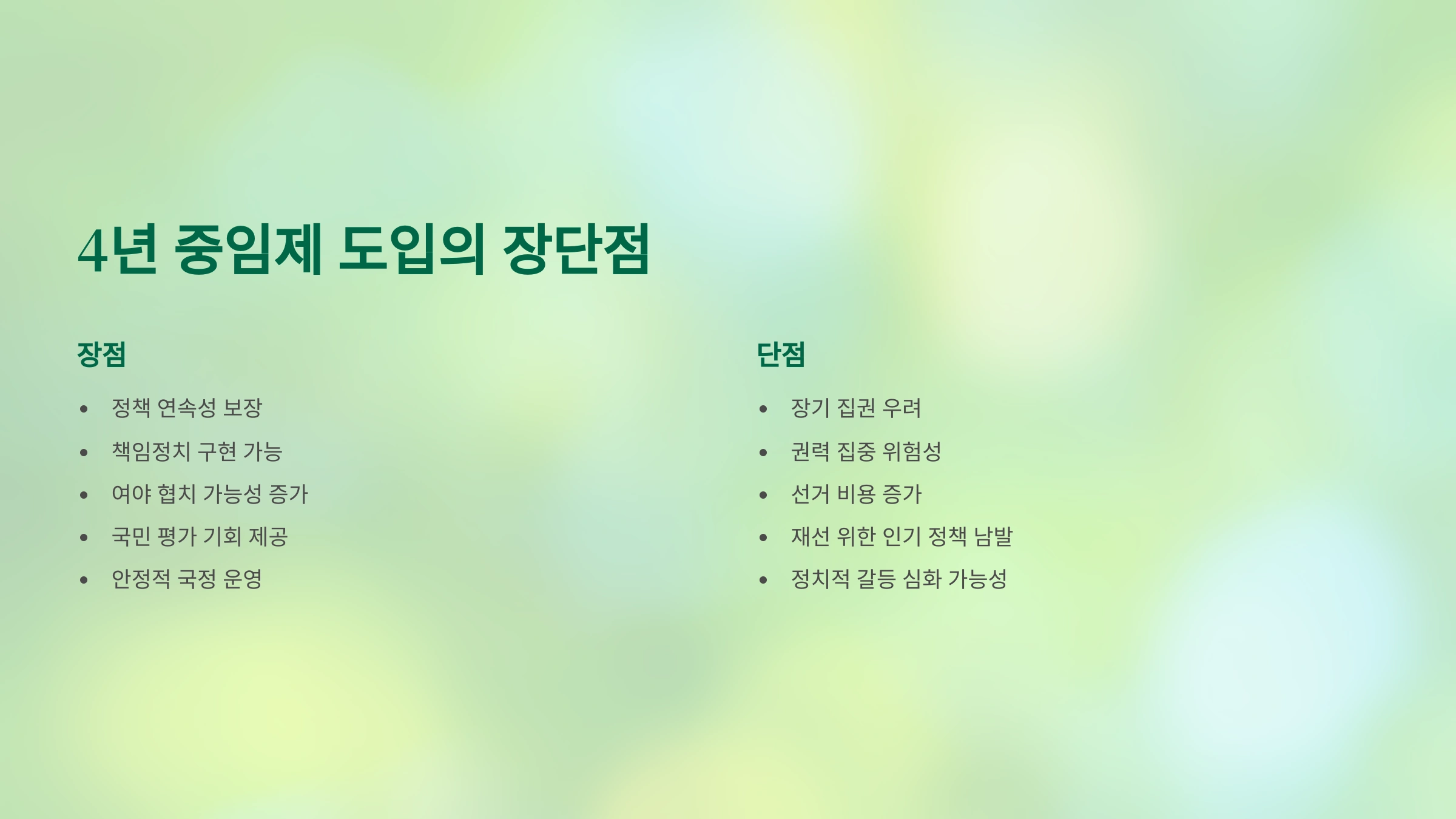 둘째, 정책의 연속성 확보입니다. 에너지 전환, 교육 개혁, 복지 정책 등 장기적인 국가 발전을 위한 정책들은 한 임기 내에 완성되기 어렵습니다. 4년중임제는 이러한 정책들이 중단 없이 지속될 수 있는 환경을 제공합니다.
