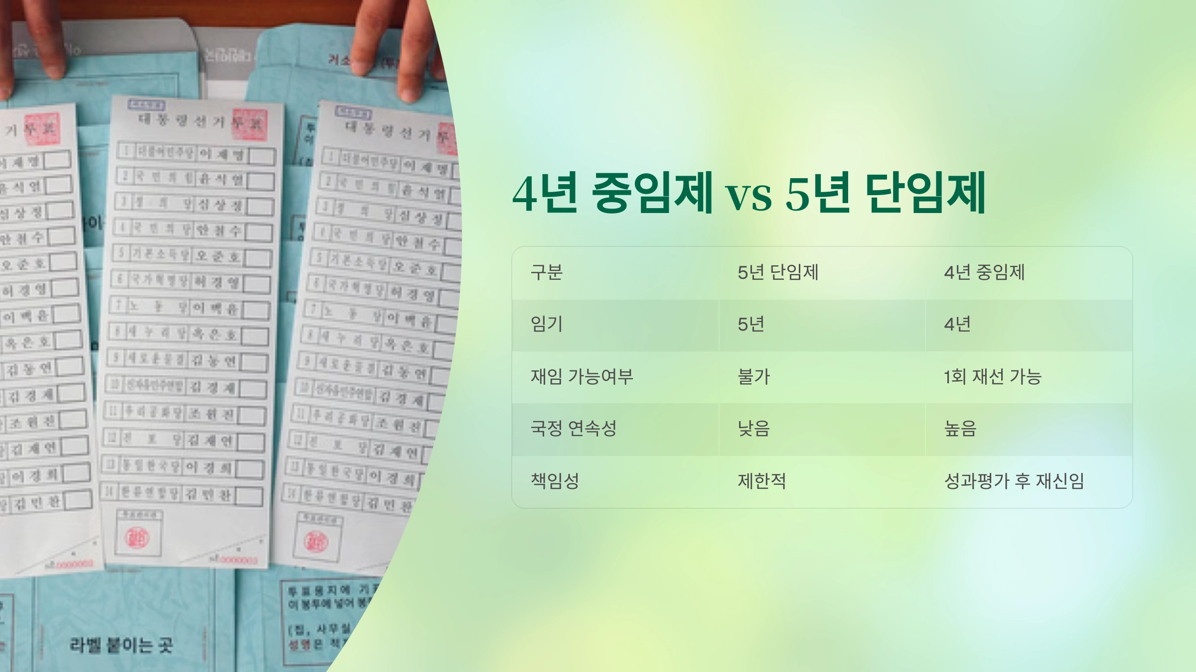4년중임제와 5년 단임제의 가장 큰 차이는 재선 가능 여부입니다. 4년중임제에서는 두 번의 4년 임기를 통해 최대 8년간 국정을 운영할 수 있는 반면, 5년 단임제에서는 5년이 지나면 모든 정책이 중단될 수 있습니다.