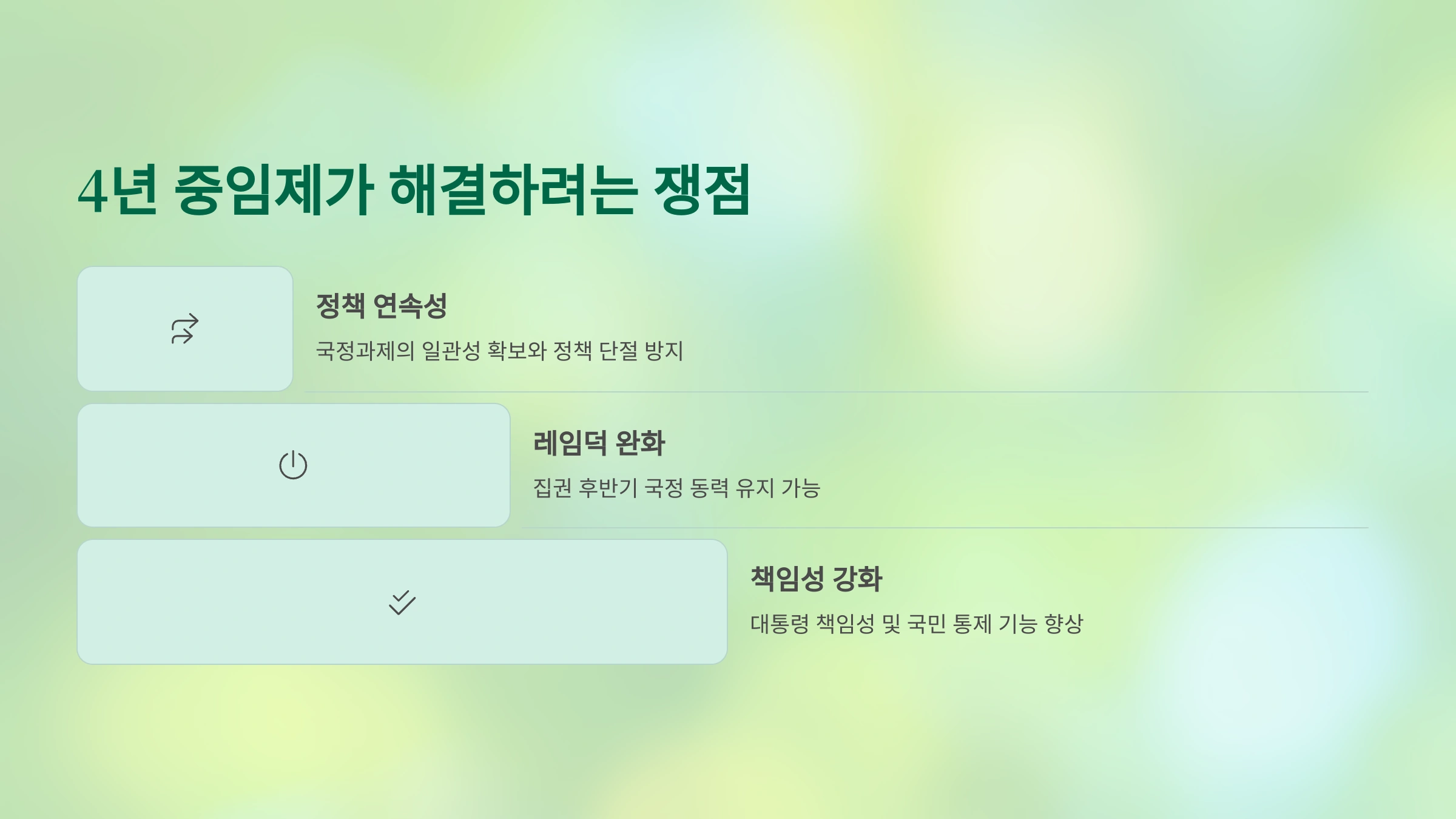 4년중임제가 해결하고자 하는 첫 번째 문제는 레임덕 현상의 완화입니다. 5년 단임제에서는 임기 후반부에 대통령의 권력이 약화되어 정책 추진이 어려워지는 현상이 반복됩니다. 4년중임제에서는 재선 가능성이 있기 때문에 대통령이 임기 내내 책임감 있는 국정 운영을 지속할 동기가 있습니다.