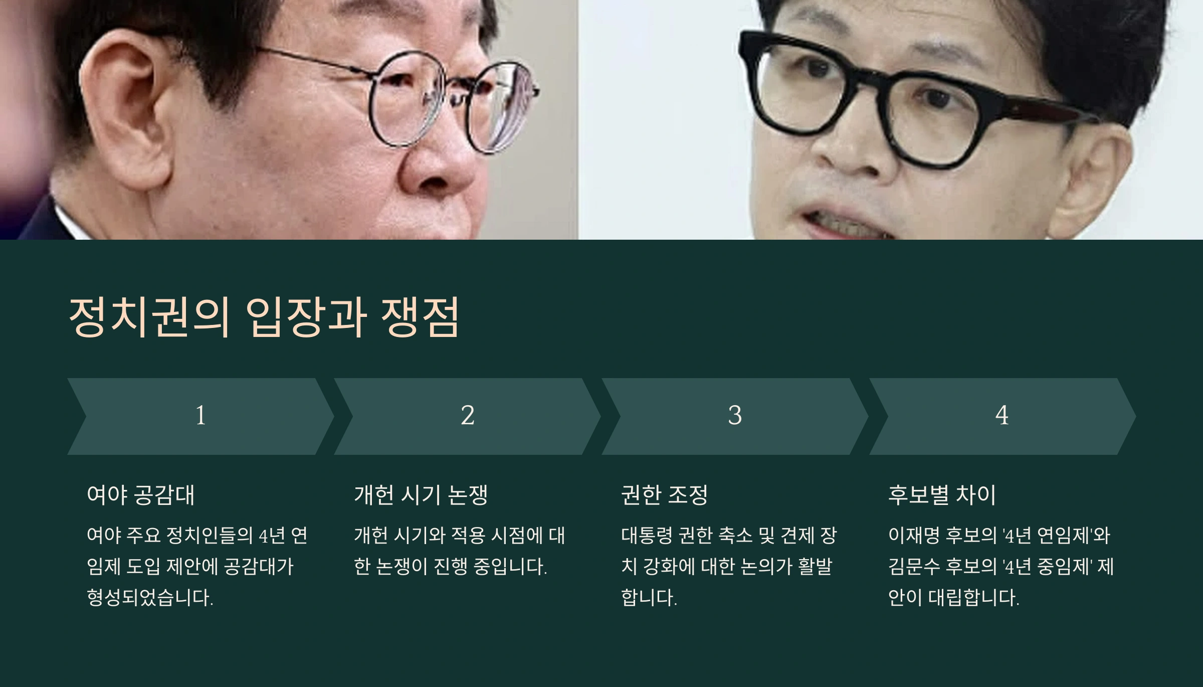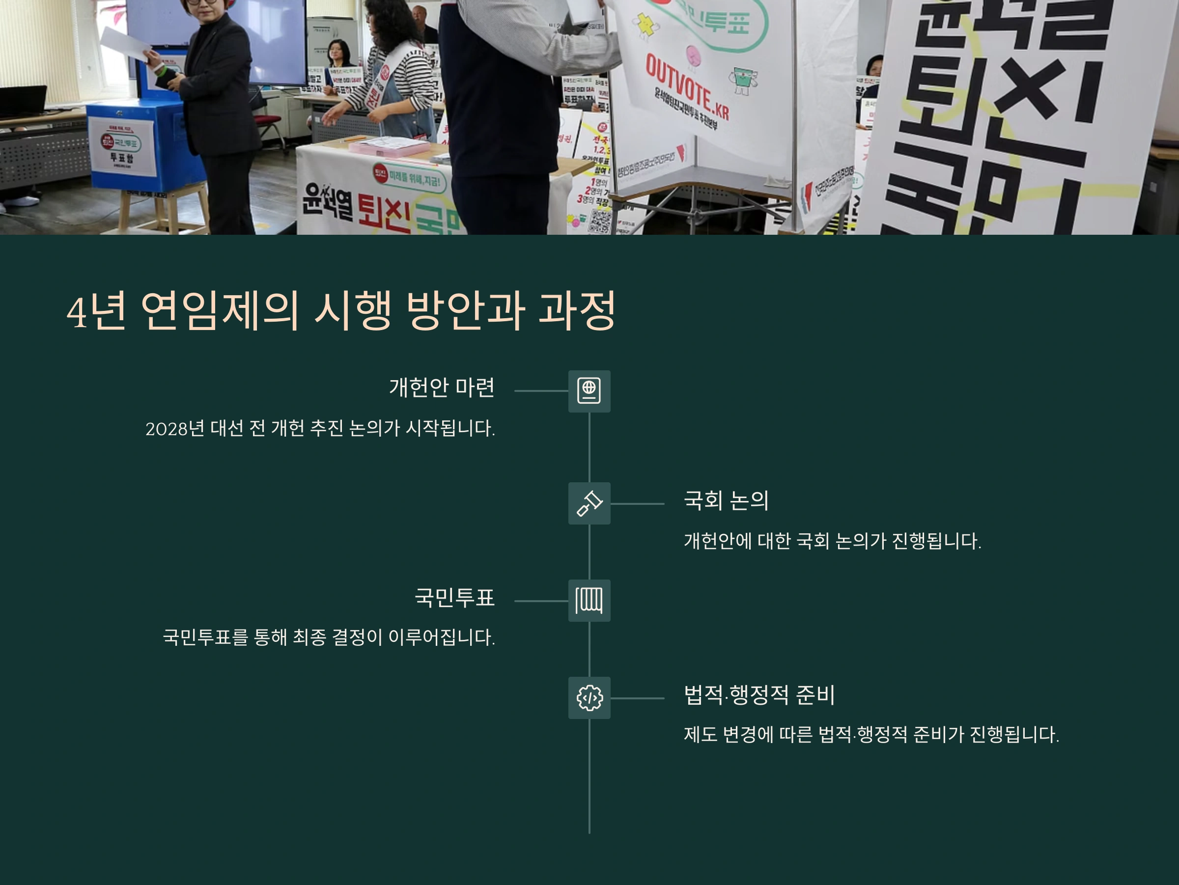 3. 시행 시기: 개헌이 확정되면 2028년 이후 대통령 선거부터 4년 연임제가 적용될 수 있습니다.